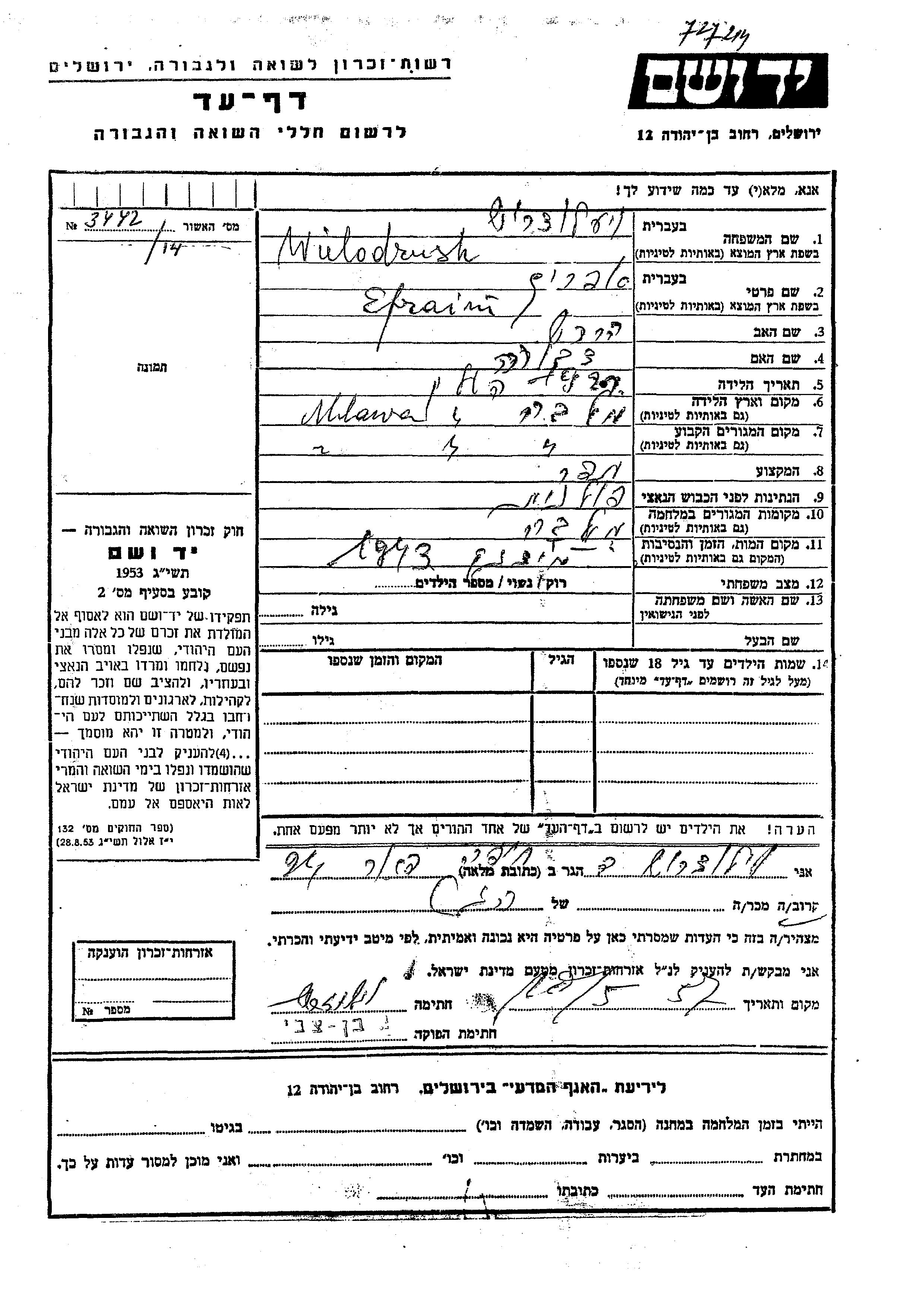 Efraim Wielodrush was born in Mlawa, Poland, 1927 to Hersh and Dvora. He was an uppers cutter/tailor. Prior to WWII he lived in Mlawa, Poland. During the war he was in Mlawa, Poland. Efraim was murdered in the Shoah. Place of death: Majdanek, Poland, 1943.
