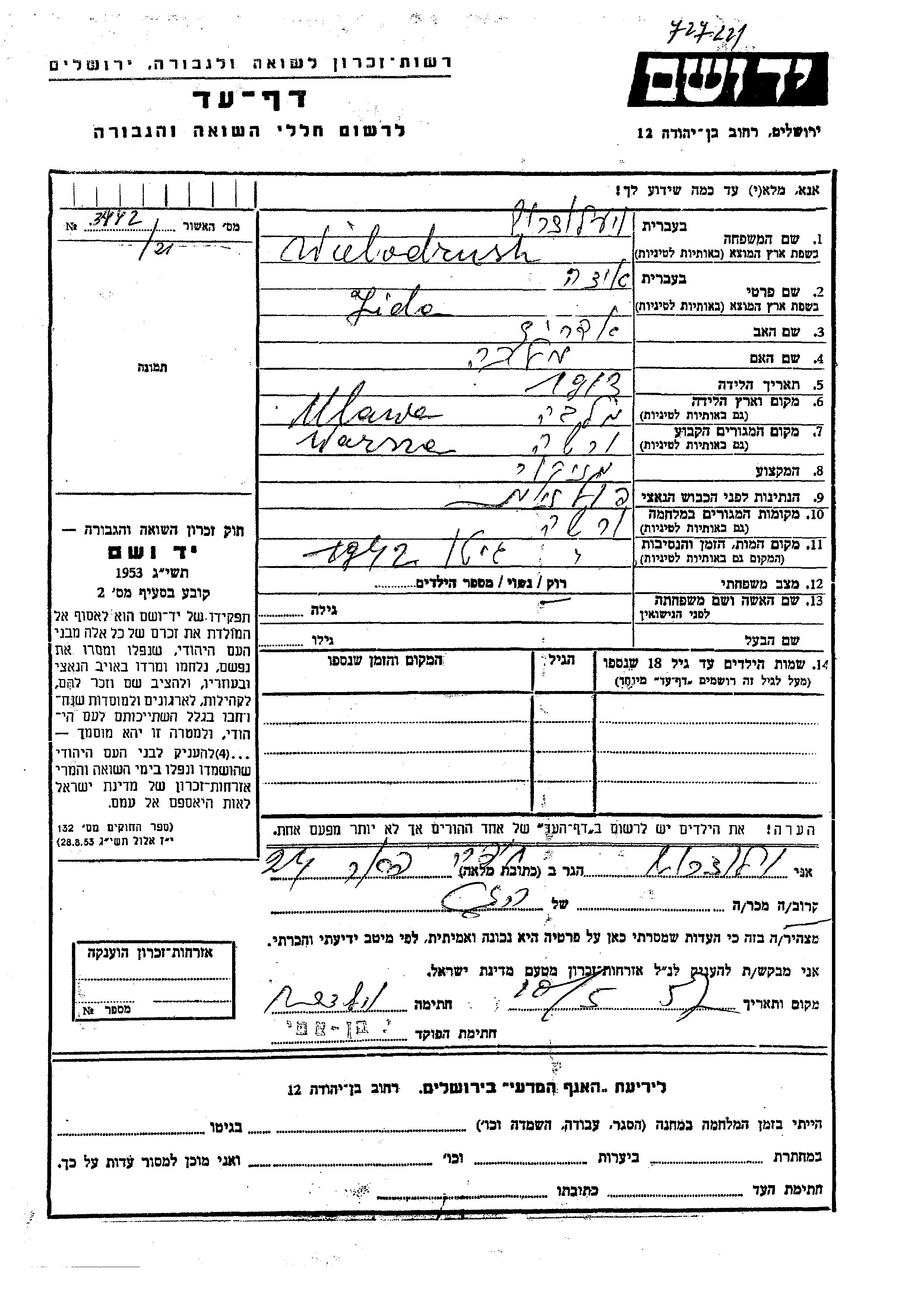 Yida Wieledróż was born in Mlawa, Poland, 1913 to Avrum and Malka. She was single. Prior to WWII she lived in Warsaw, Poland. During the war she was in Warsaw, Poland. Yida was murdered in the Shoah. Place of death: Warsaw, Poland, 1942.