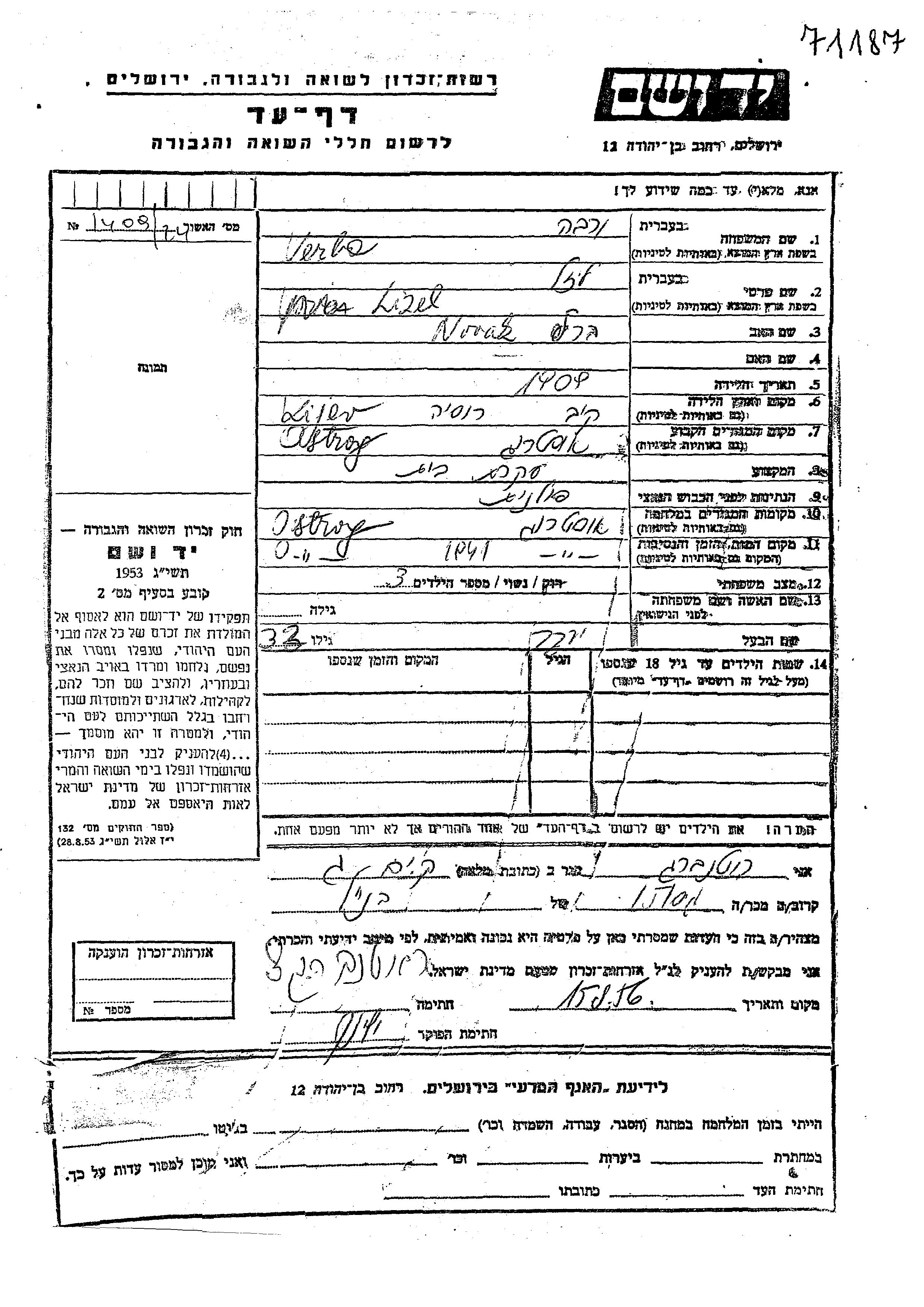 Lizel Verba nee Novak was born in Kiev, Ukraine (USSR), 1909 to Berl. She was a housewife and married to Yaakov. Prior to WWII she lived in Ostrog, Poland. During the war she was in Ostrog, Poland. Lizel was murdered in the Shoah. Place of death: Ostrog, Poland, 1941.