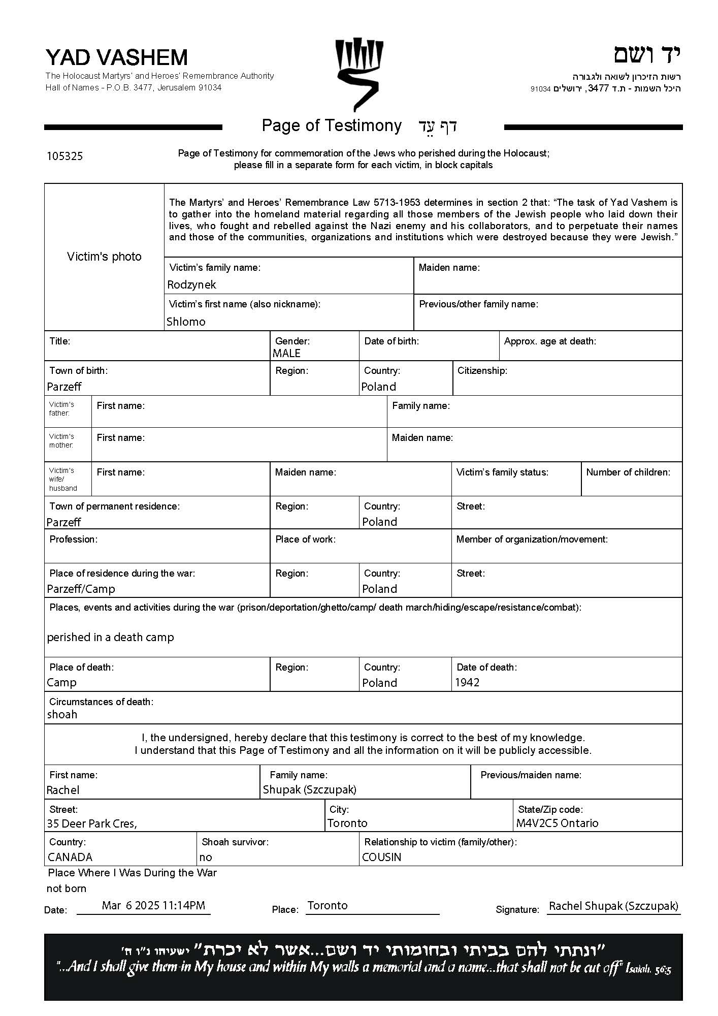 Shlomo Rodzynek was born in Parzeczew, Poland. Prior to WWII he lived in Parzeczew, Poland. During the war he was in Camp. Shlomo was murdered in the Shoah. Place of death: Camp, 1942.