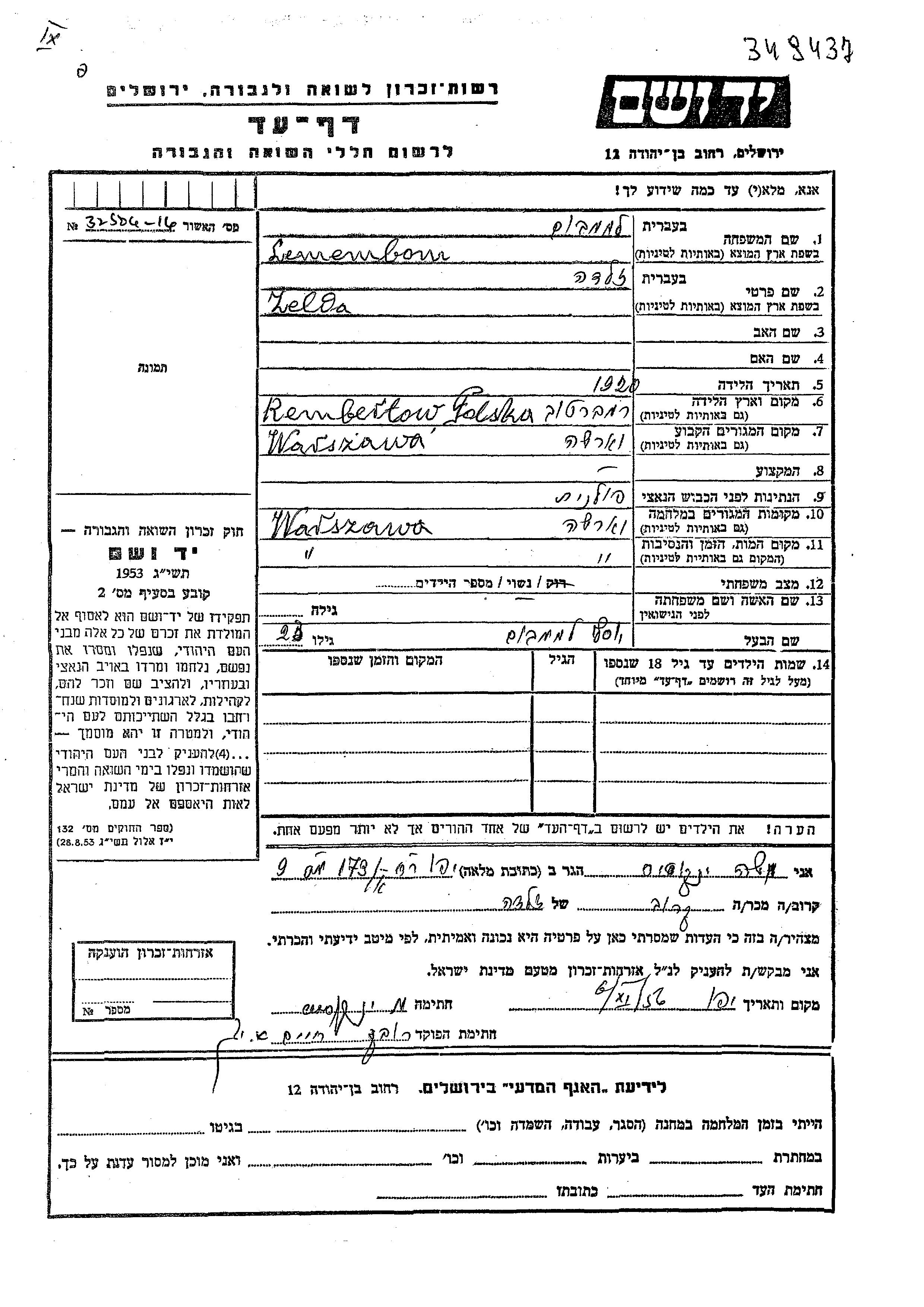 Zelda Lemembom was born in Rembertow, Poland, 1920. She was married to Yosef. Prior to WWII she lived in Rembertow, Poland. During the war she was in Warszawa, Poland. Zelda was murdered in the Shoah. Place of death: Warszawa, Poland.