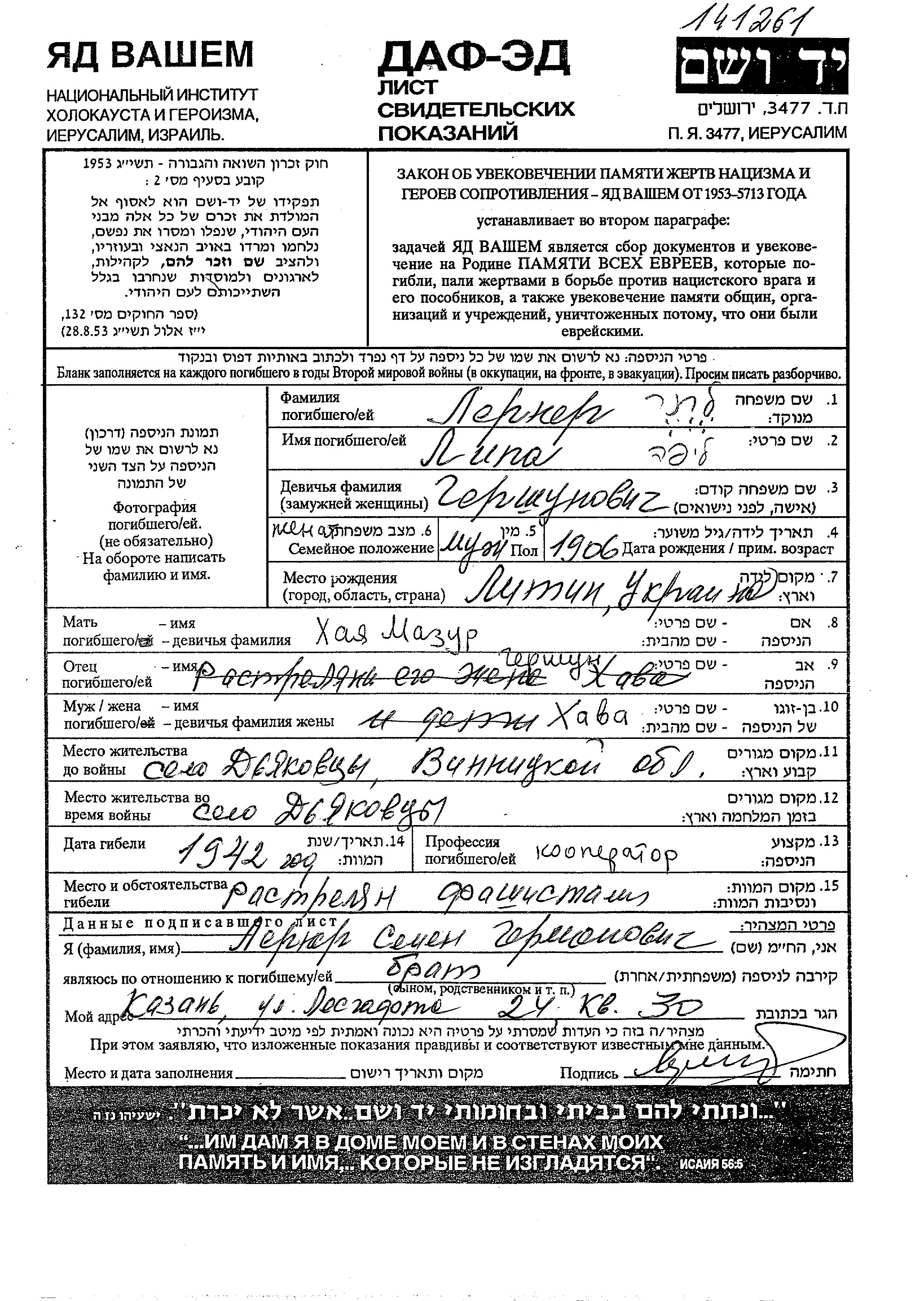 Lerner Semion Dyakovtsy, Ukraine (USSR) Page of Testimony
