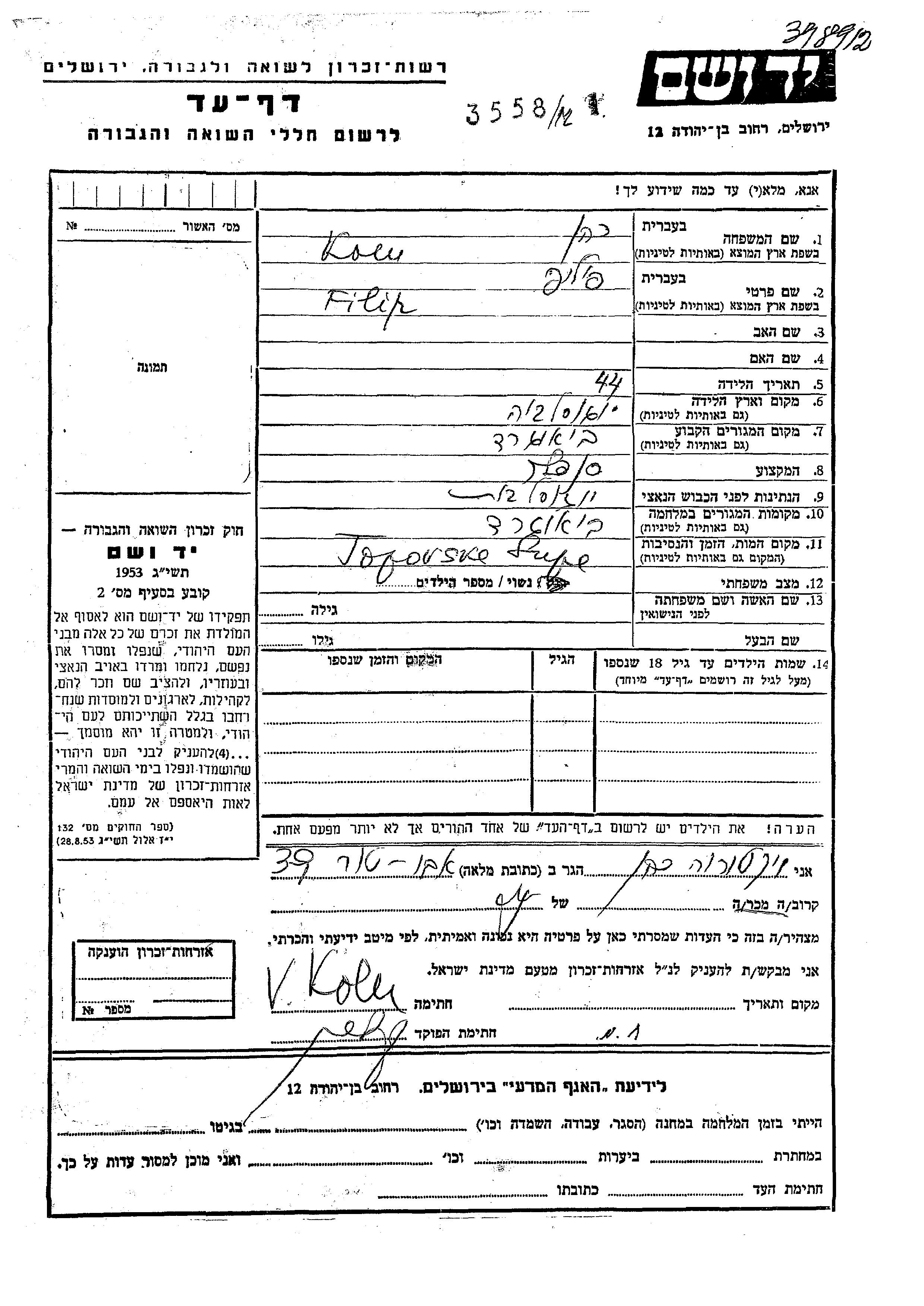 Filip was murdered in the Shoah. Place of death: Topovske Šupe, Yugoslavia.