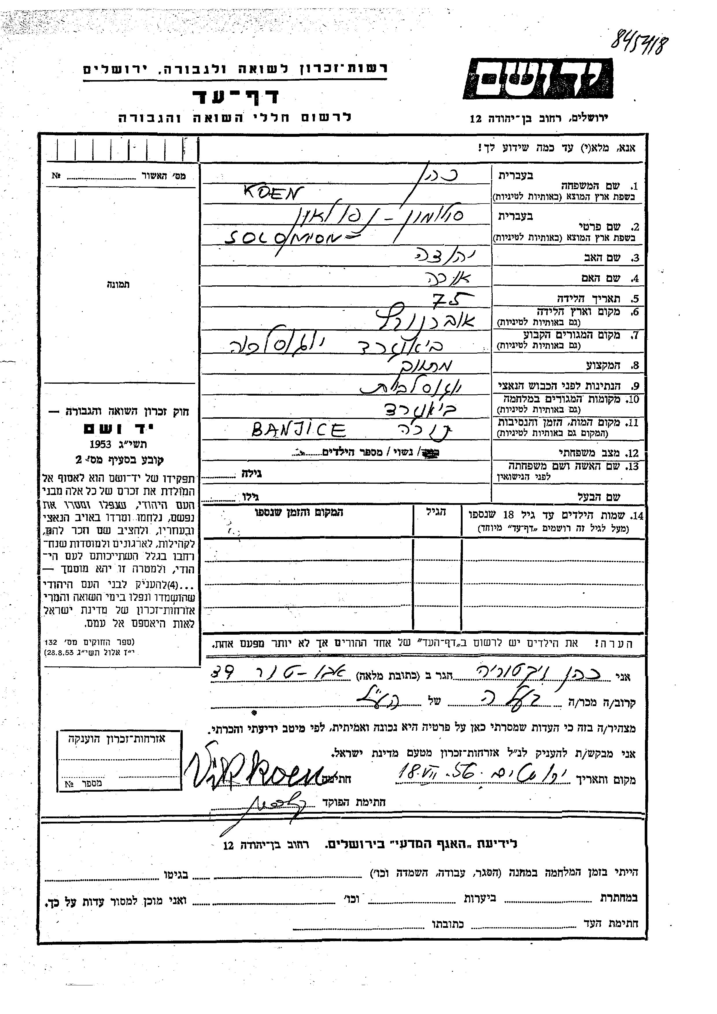 Solomon Napoleon Koen was born in Obrenovac, Yugoslavia to Yehuda and Ora. He was a middleman and married. Prior to WWII he lived in Beograd, Yugoslavia. During the war he was in Beograd, Yugoslavia.
