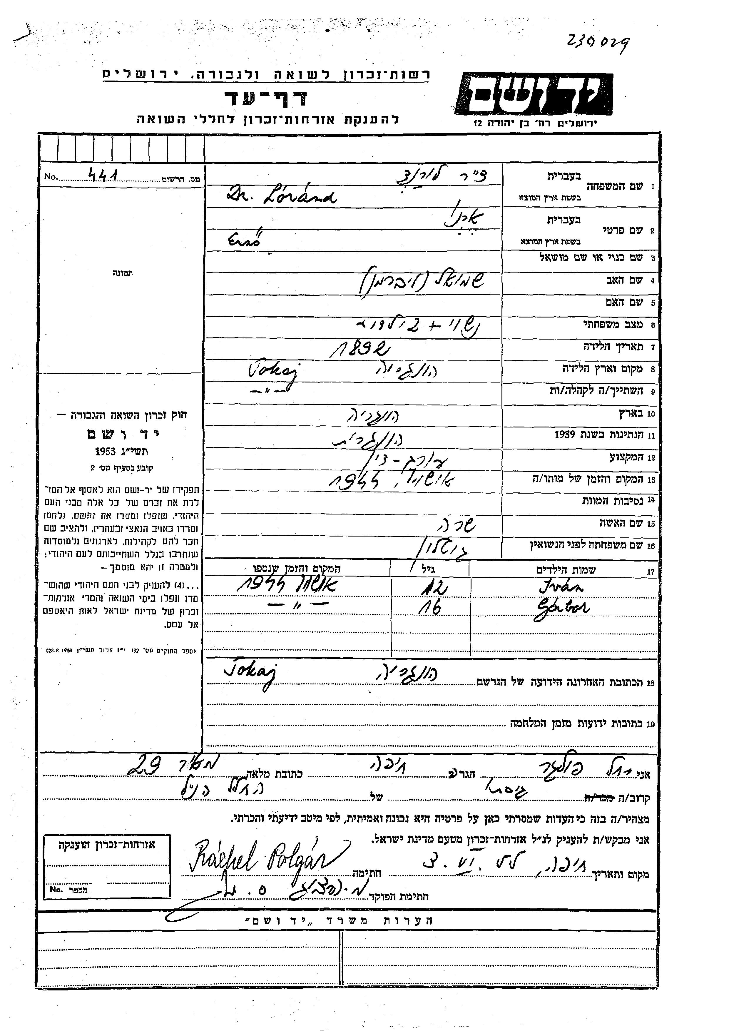 Lorand Erno 1892 Tokaj, Hungary Page of Testimony