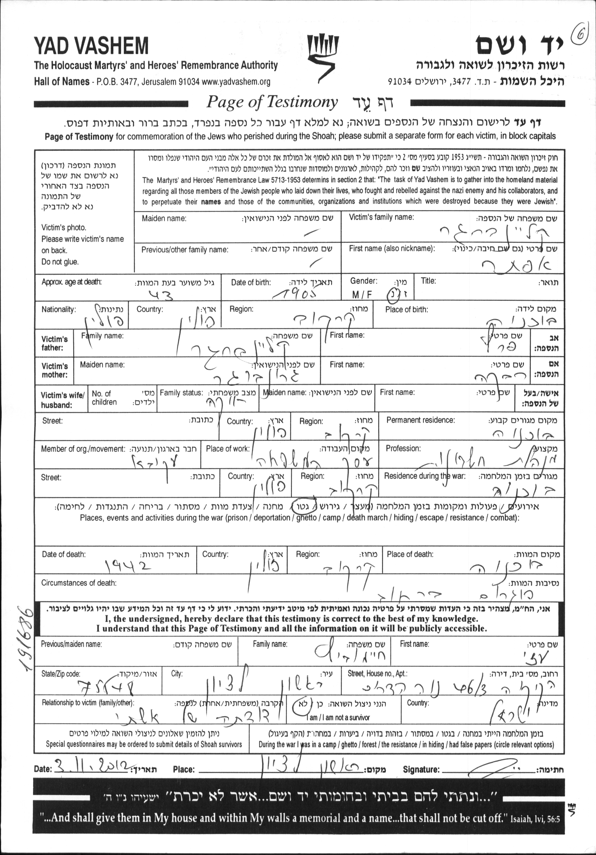 Yad Vashem - Pages of Testimony Names Memorial Collection