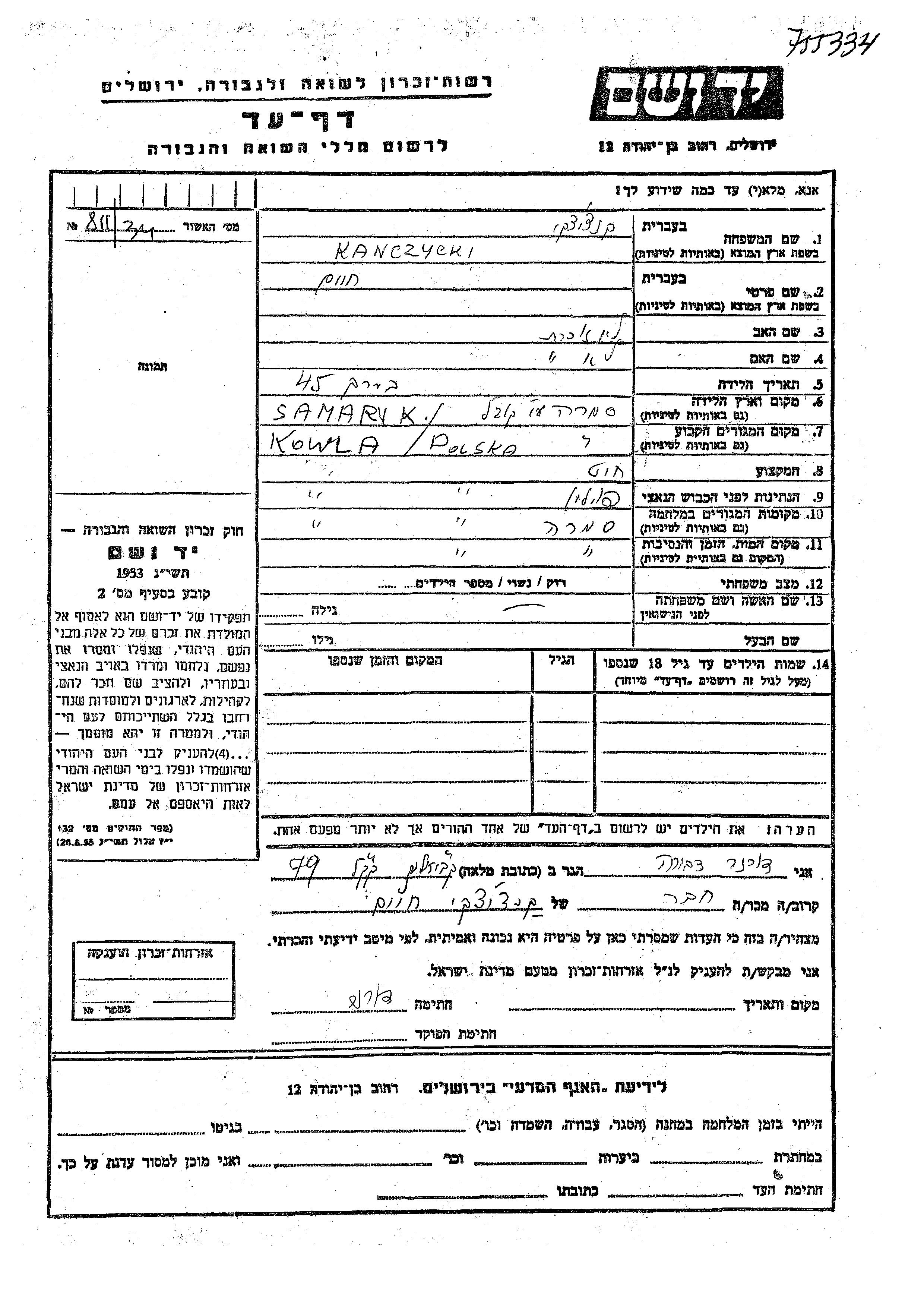 Kanczycki Khaim Samary, Poland Page of Testimony