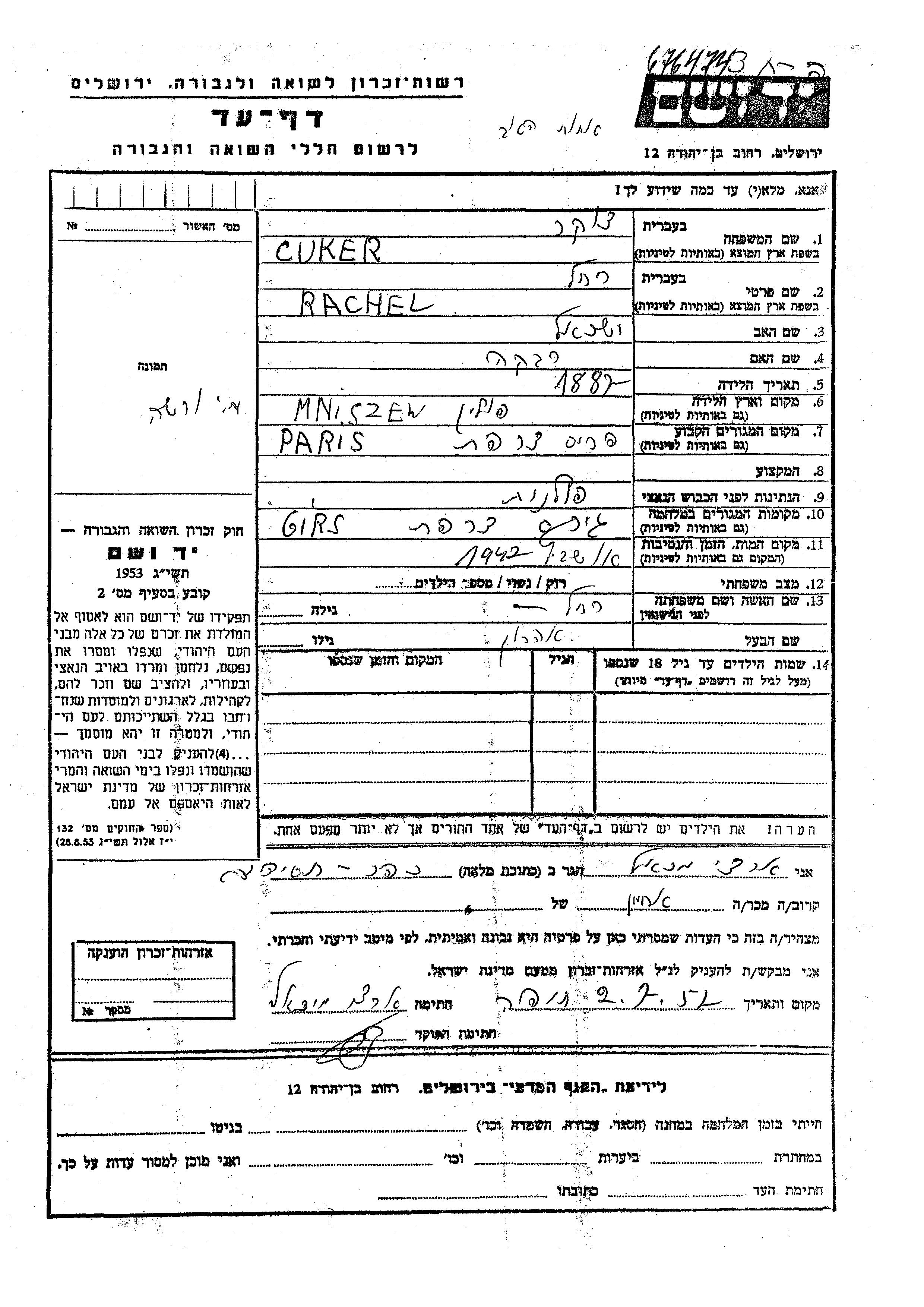 Rachel Cuker was born in Mniszew, Poland, 1887 to Yisrael and Rivka. She was married to Aharon. Prior to WWII she lived in Paris, France. During the war she was in Gurs, France. Rachel was murdered in the Shoah. Place of death: Auschwitz, Poland, 1942.