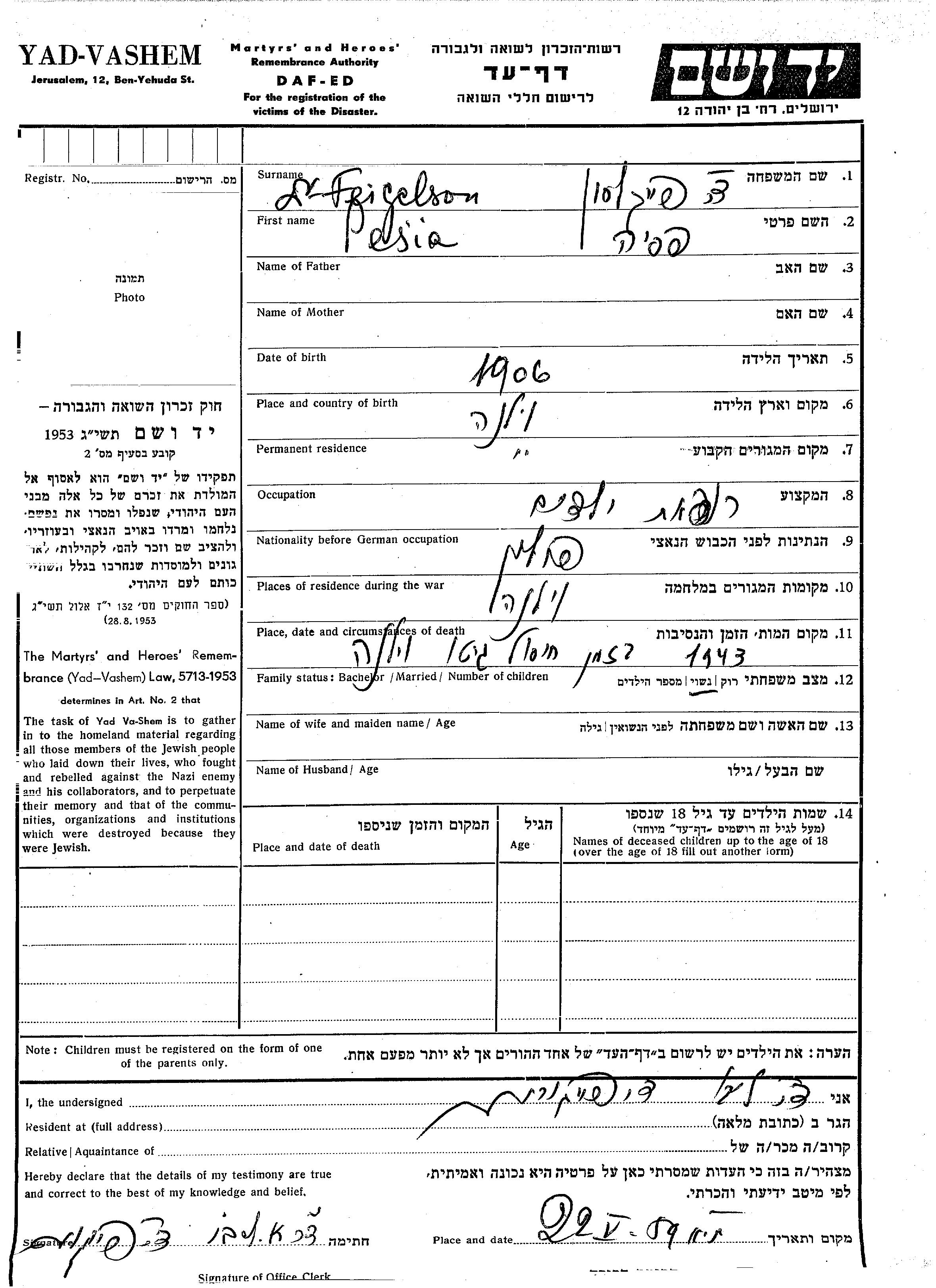 Yad Vashem - Pages of Testimony Names Memorial Collection