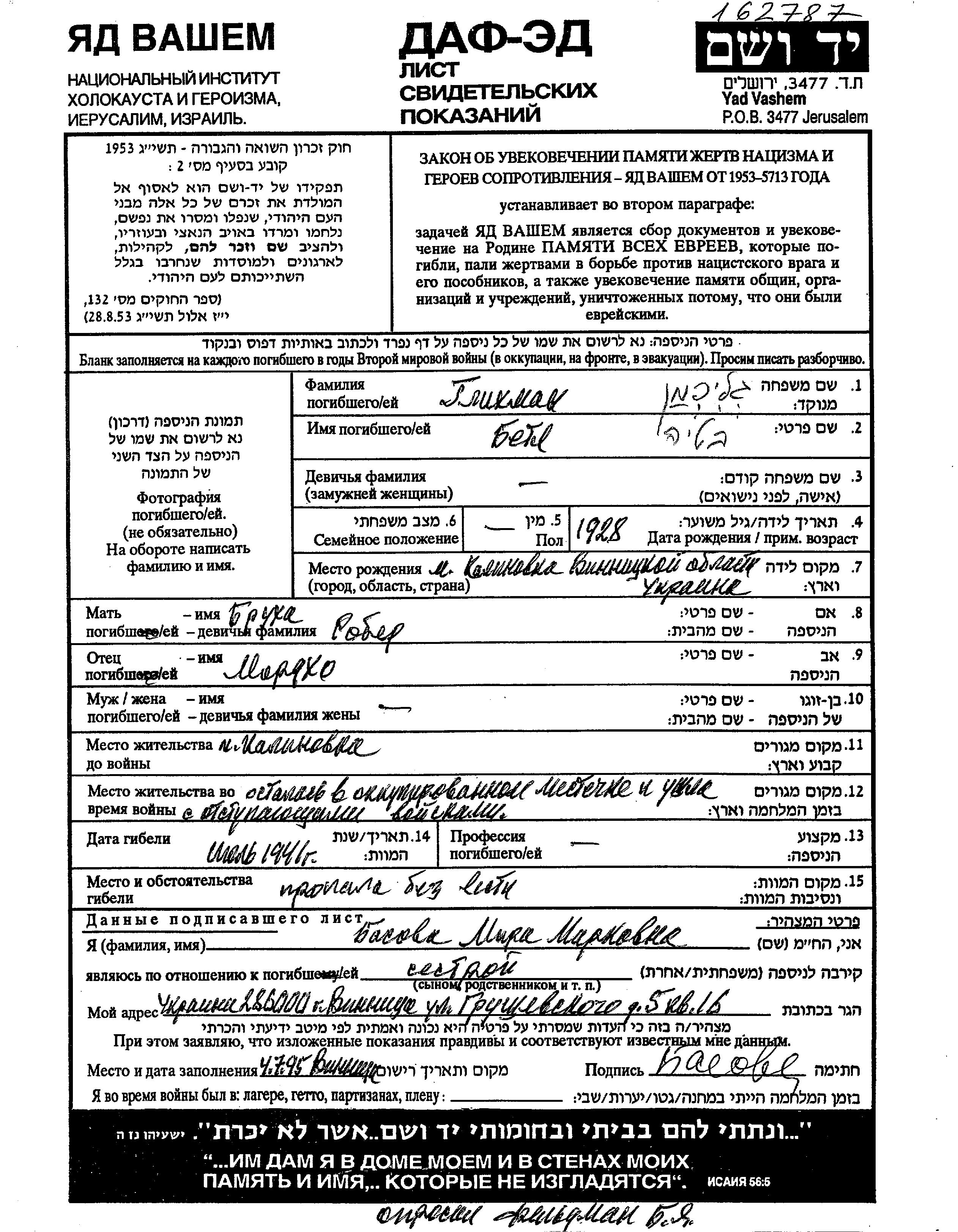 Glikman Basov Mira Kalinovka, Ukraine (USSR) Page of Testimony