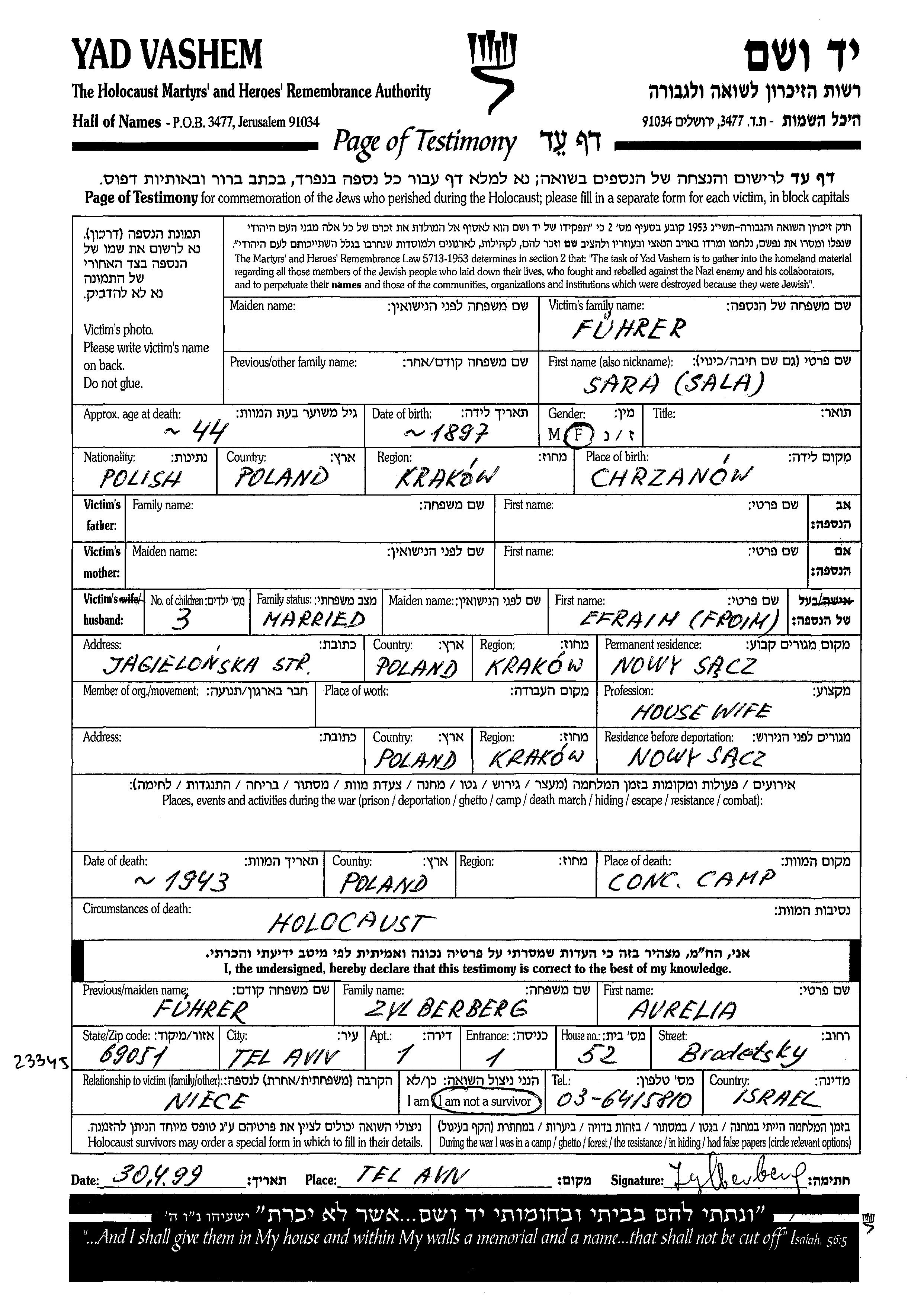 Sara Fuhrer Kurtz nee Kurtz was born in Chrzanow, Poland, 1897. She was a housewife. Prior to WWII she lived in Nowy Sącz, Poland. Sara was murdered in the Shoah. Place of death: Camp, Poland, 1943.