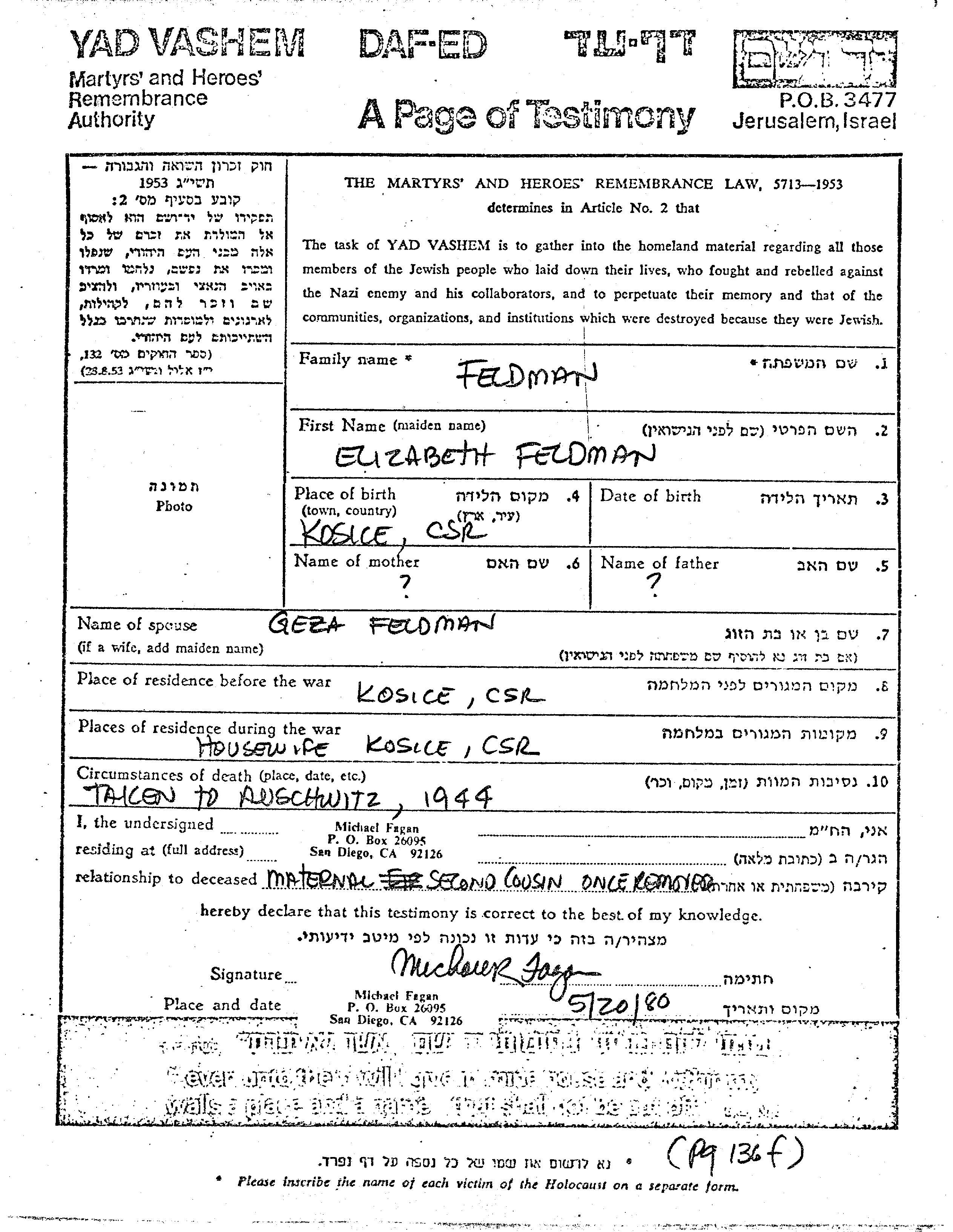 Feldman Elizabeth Kosice, Czechoslovakia Page of Testimony