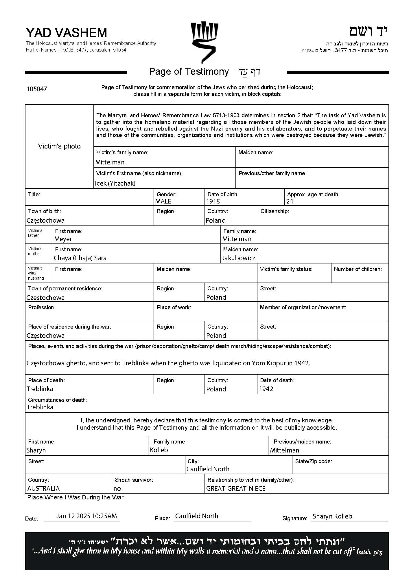 Mittelman Icek 1918 Czestochowa, Poland Page of Testimony (digital)