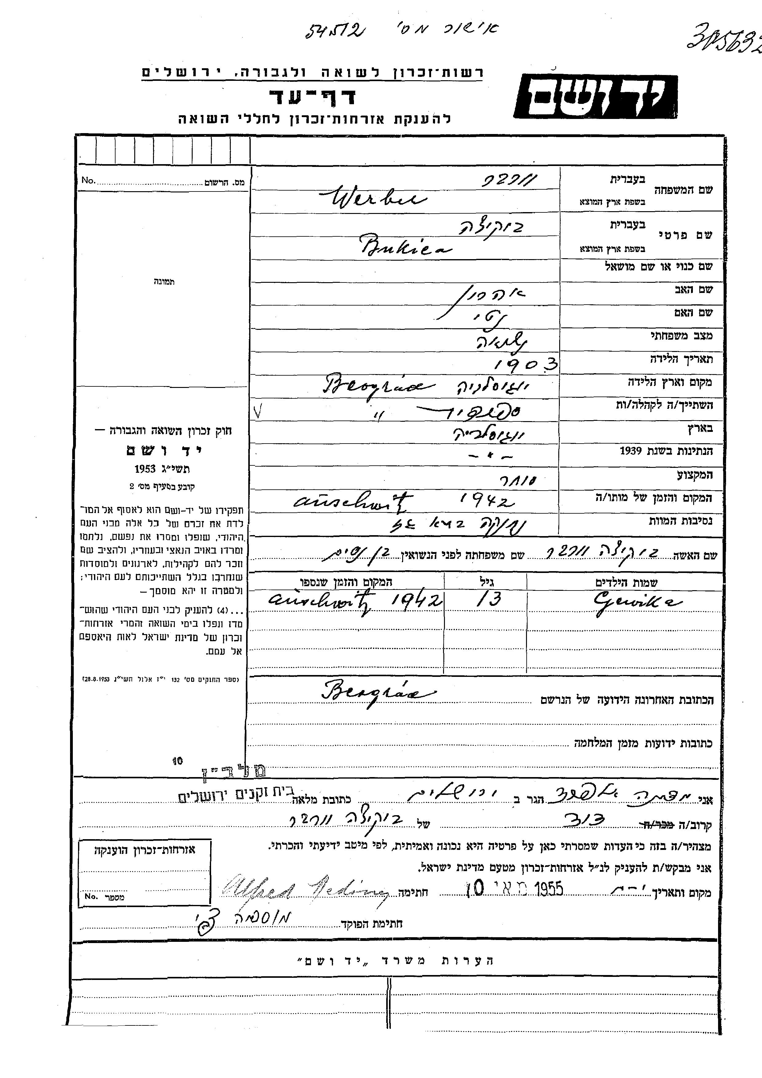 Bukica Werber nee Ben Nasim was born in Beograd, Yugoslavia, 1903 to Aharon and Neti. She was a merchant and married. During the war she was in Beograd, Yugoslavia.