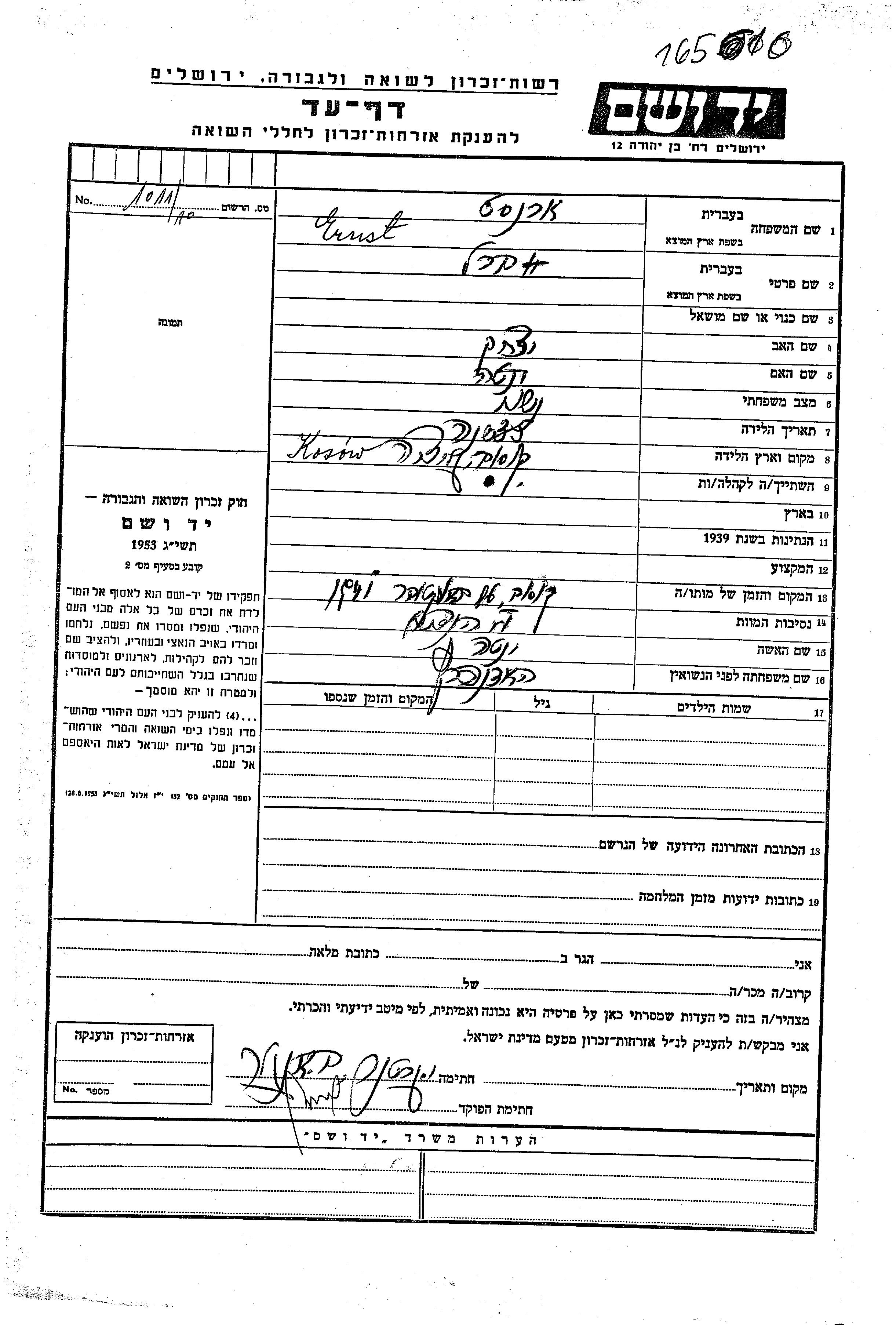Ernst Berl Kosow, Poland Page of Testimony