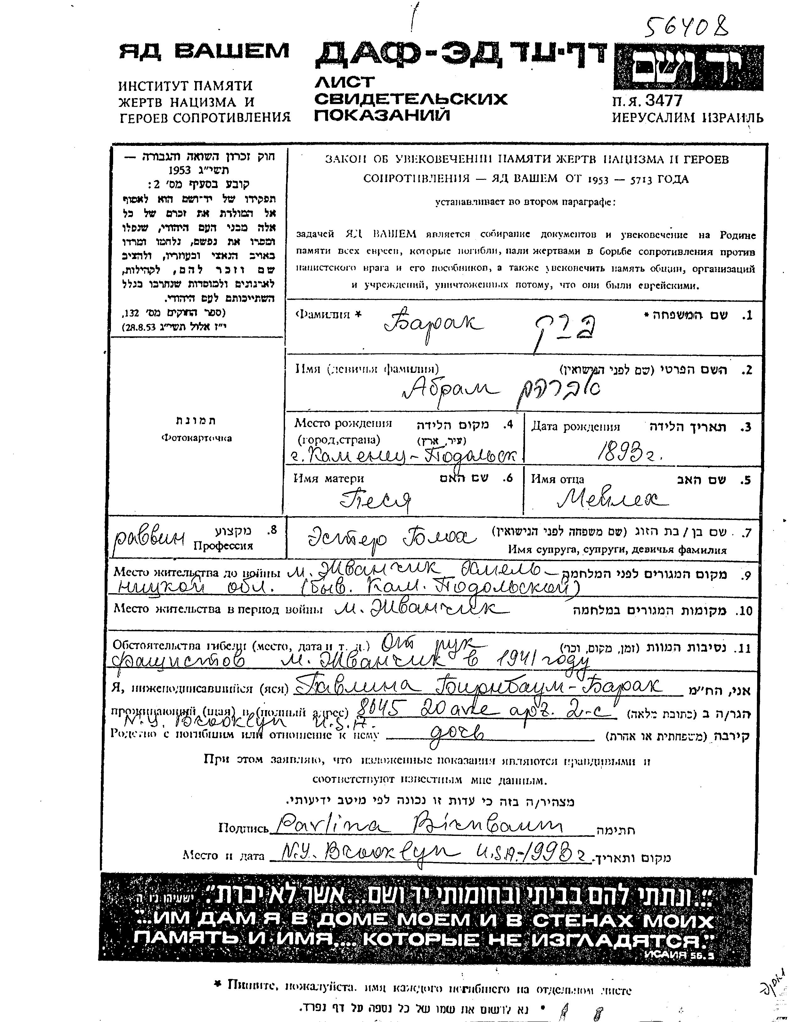 | Barak Brak Birnbaum | Pavlina | Zhvanchik, Ukraine (USSR) | Page of Testimony | |