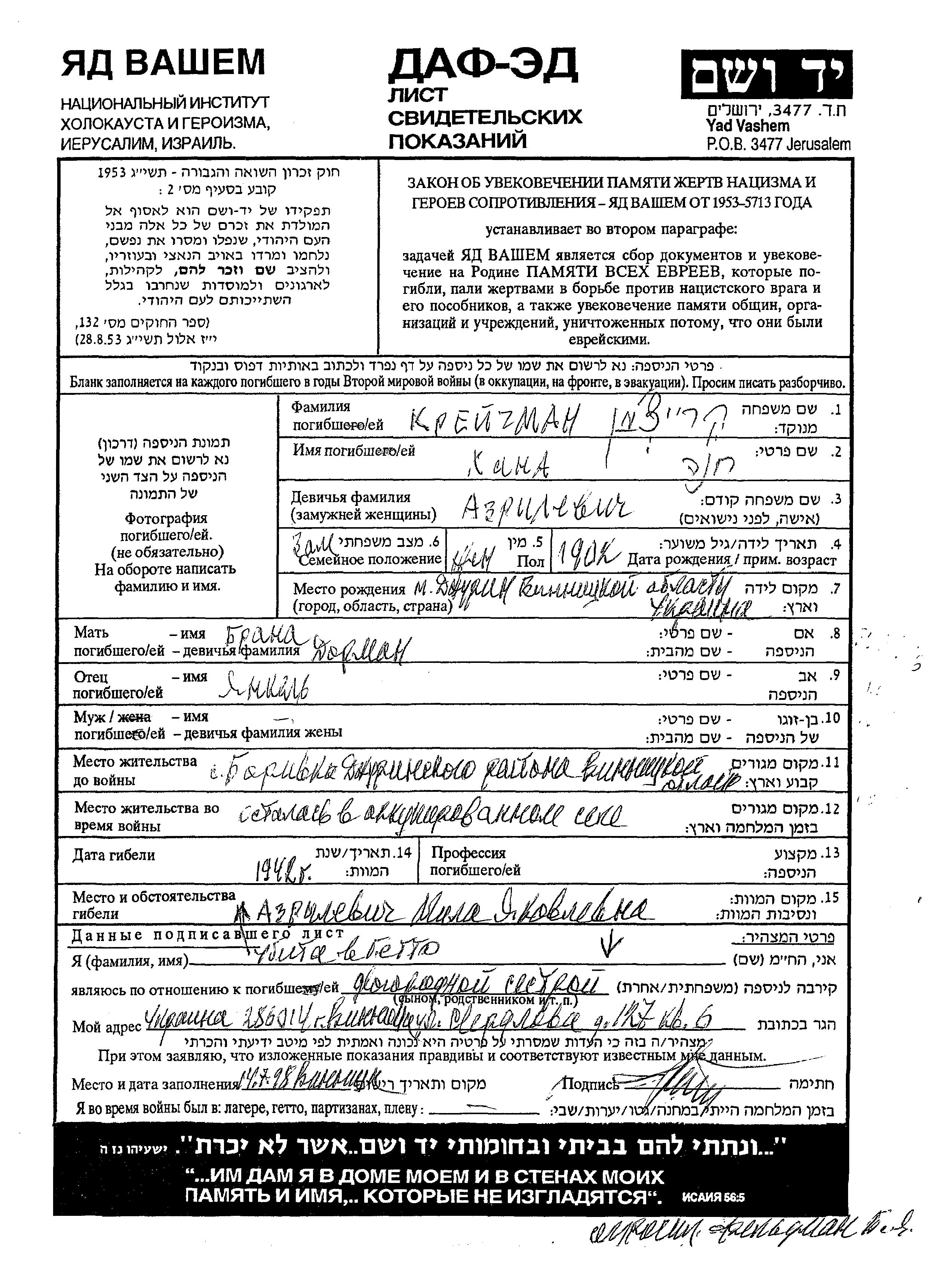 Khana Kreichman nee Azrilevitz was born in Dzhurin, Ukraine (USSR), 1902 to Yankel and Brana. She was married. Prior to WWII she lived in Borivka, Ukraine (USSR). During the war she was in Borivka, Ukraine (USSR). Khana was murdered in the Shoah. Place of death: Borivka, Ukraine (USSR), 1942.