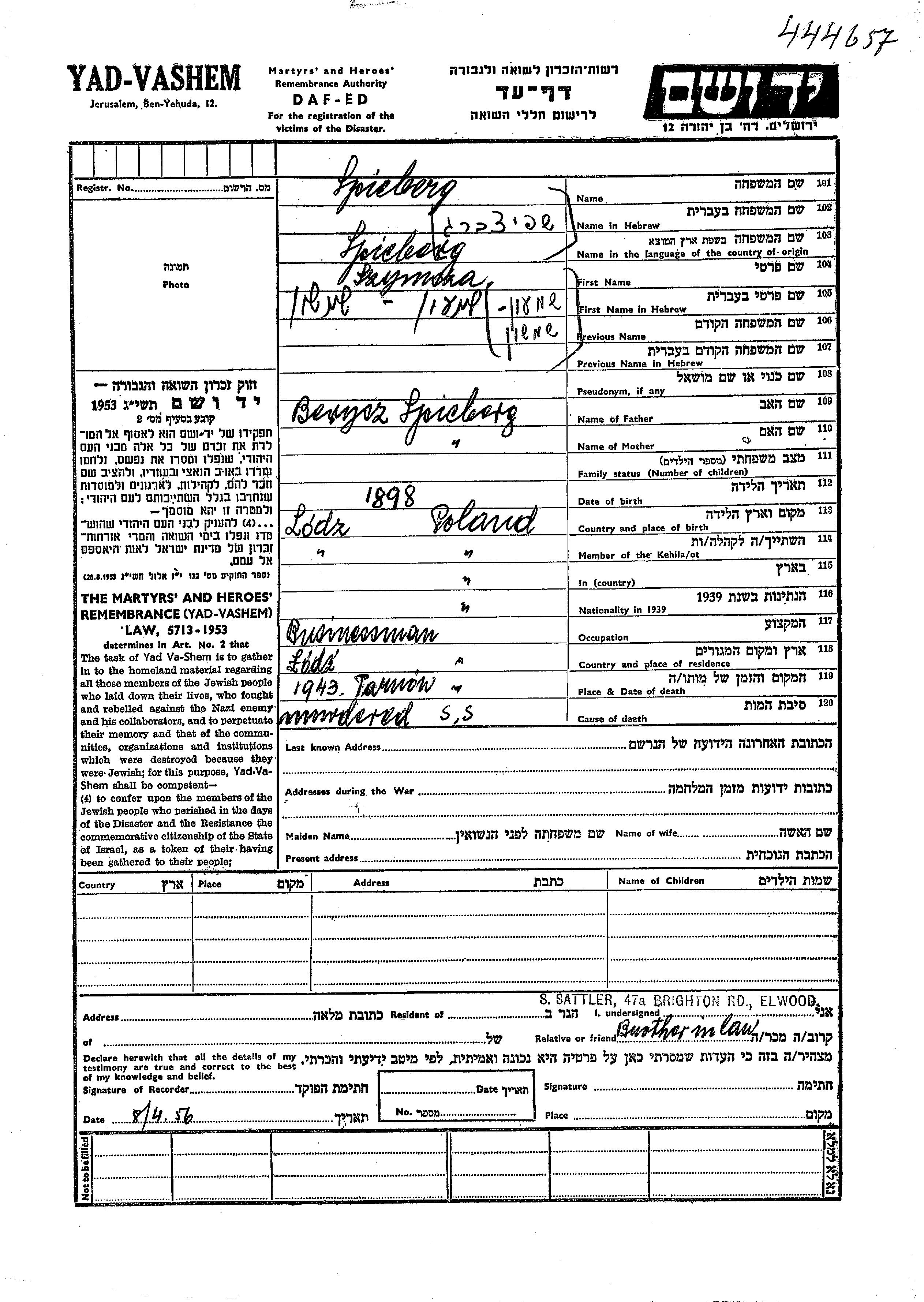 Spicberg Szymsza Shimon 1898 Lodz, Poland Page of Testimony
