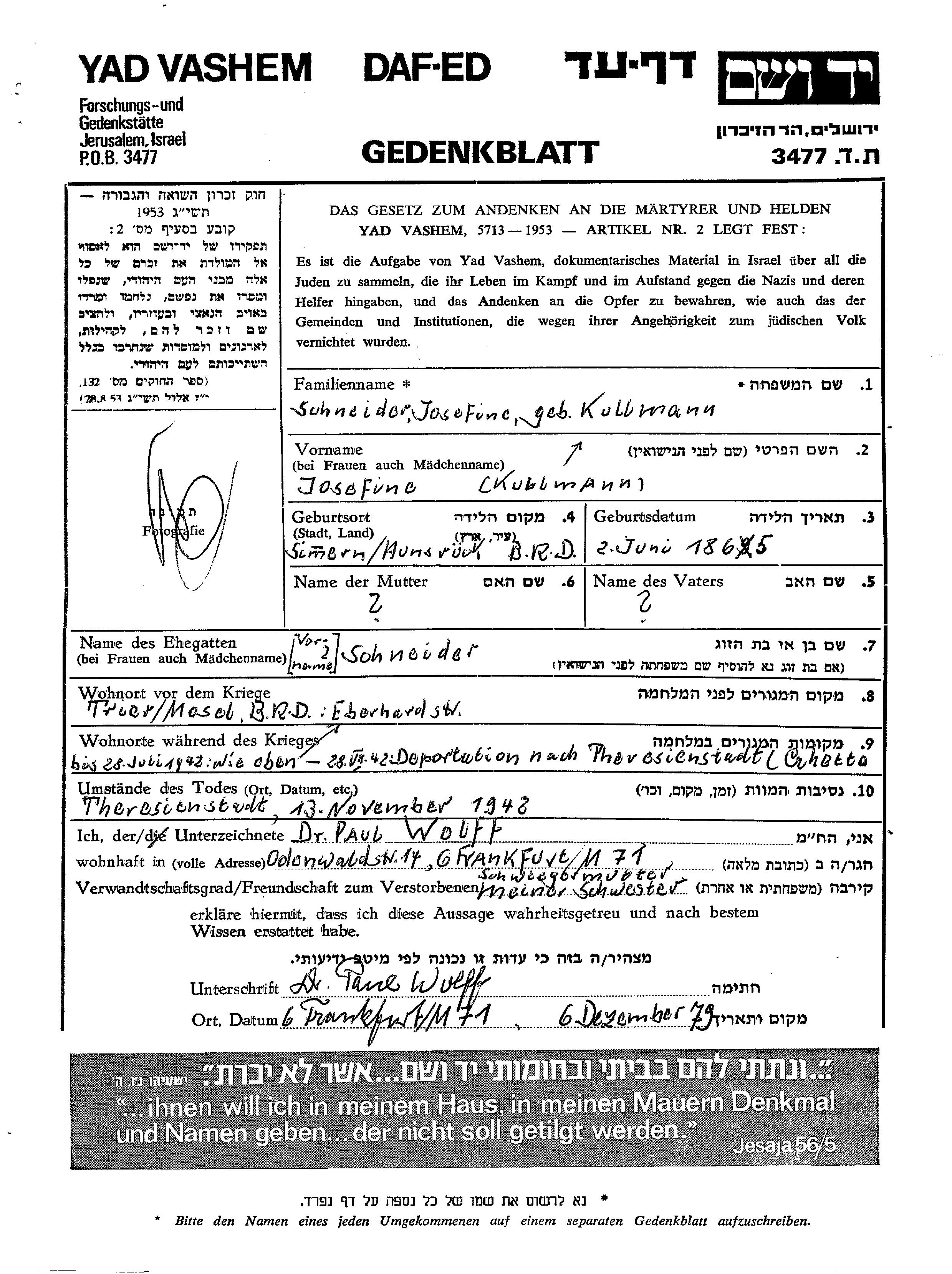 Josefine Schneider nee Kullmann was born in Simmern Hunsrueck, Germany, 1865. She was married. Prior to WWII she lived in Trier, Germany. During the war she was in Theresienstadt, Czechoslovakia.