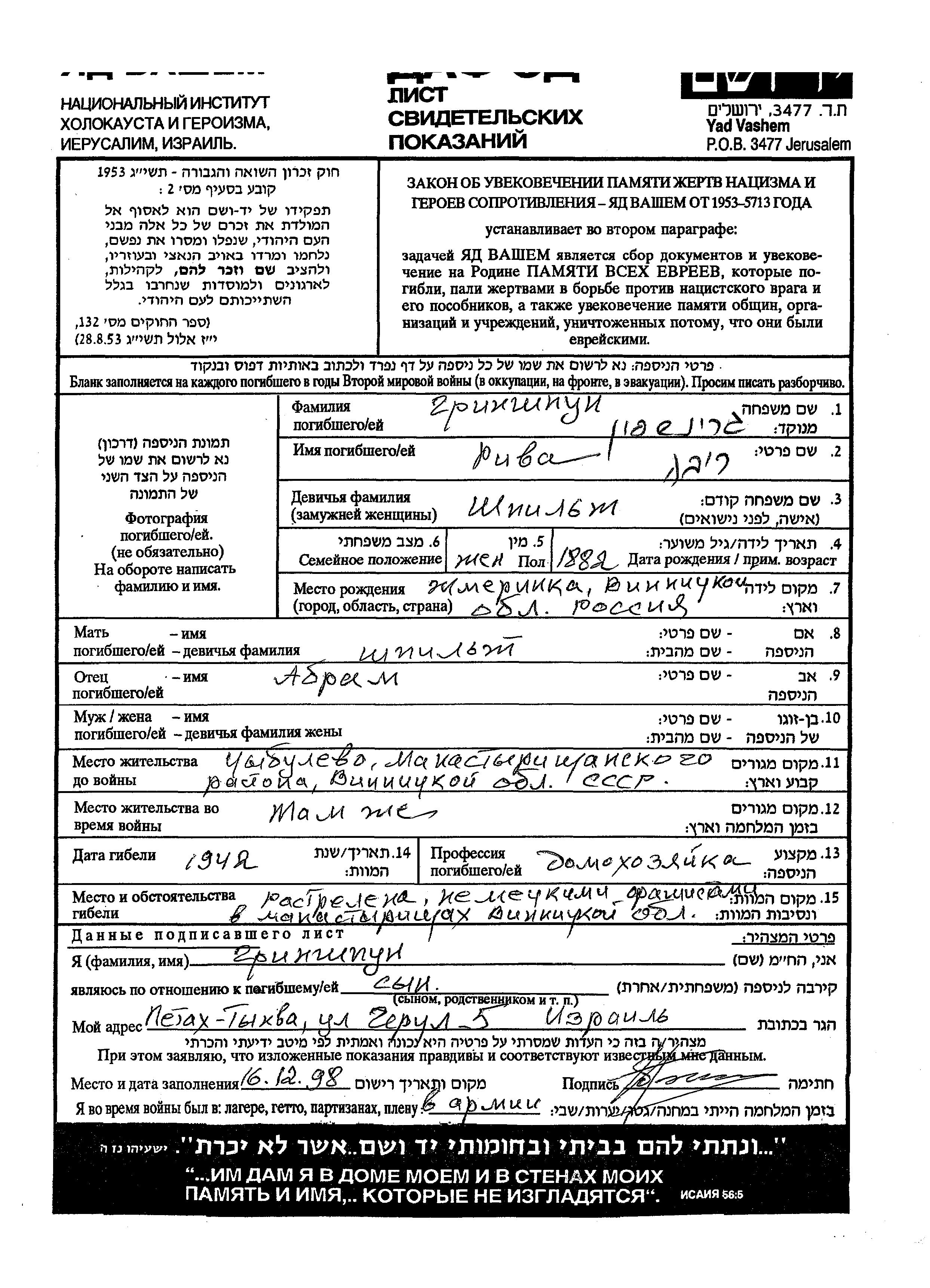 Grinshpun Moisei Tsibulev, Ukraine (USSR) Page of Testimony