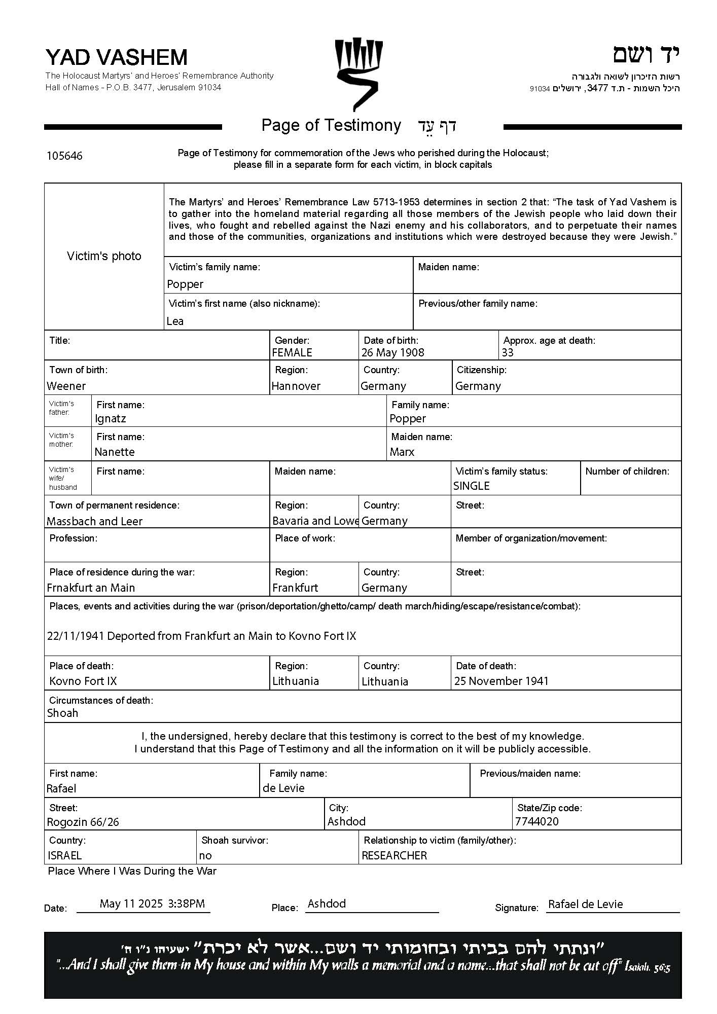 Lea Popper was born in Weener Ems, Germany, 1908 to Ignacz and Nanette nee Marx. She was single. Prior to WWII she lived in Massbach, Germany. During the war she was in Fort 9, Lithuania. Lea was murdered in the Shoah. Place of death: Fort 9, Lithuania, 25/11/1941.