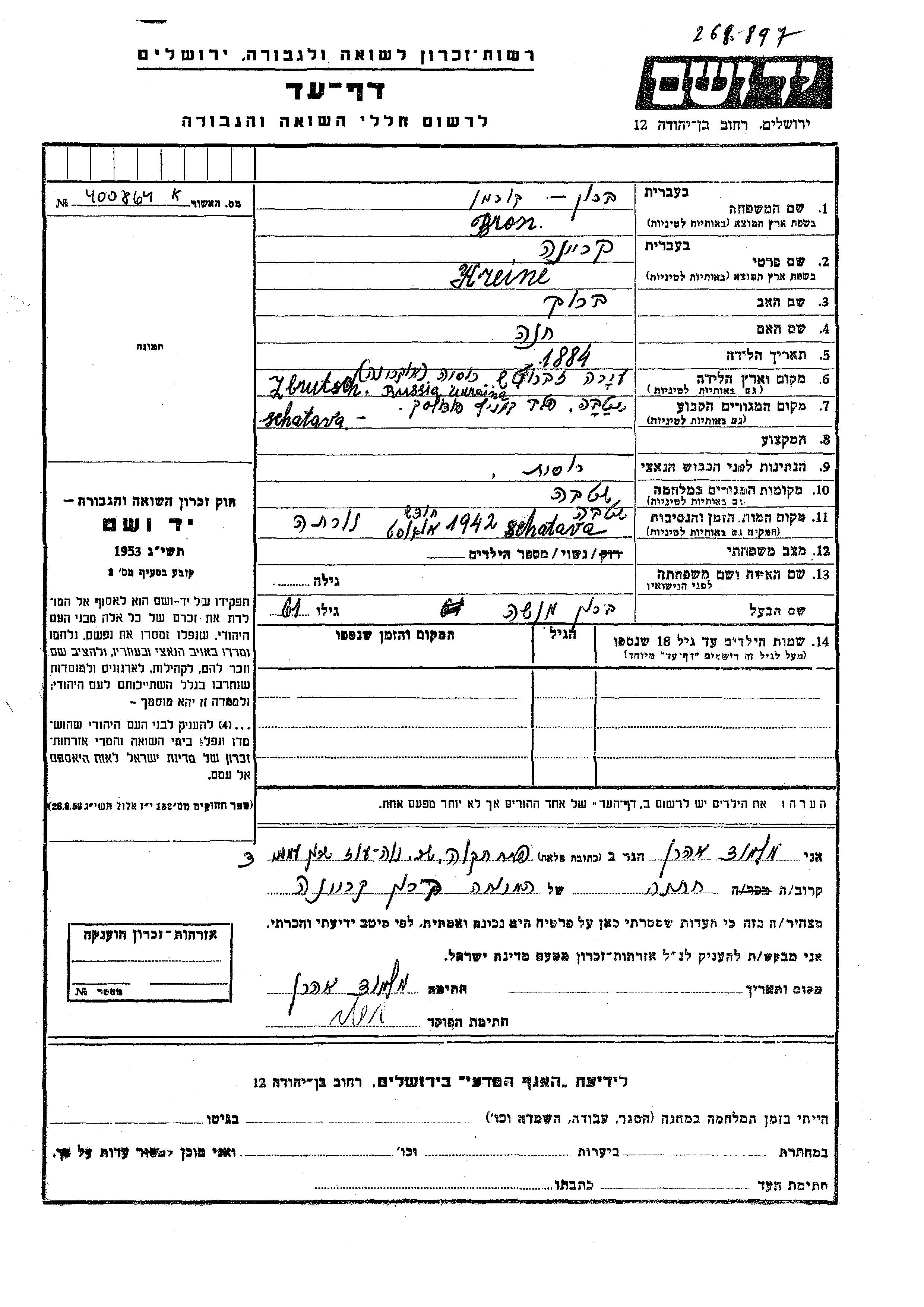 Bron Korman Kreina 1884 Shatava, Ukraine (USSR) Page of Testimony