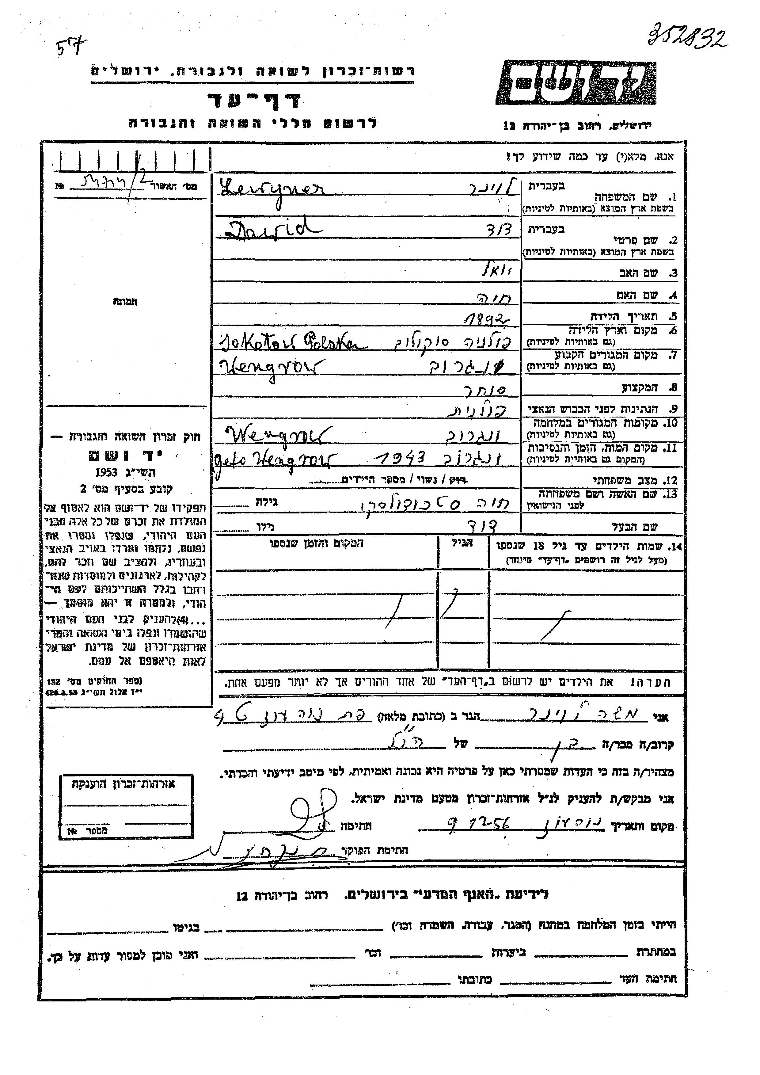 Lewyner Dawid 1892 Wengrow, Poland Page of Testimony