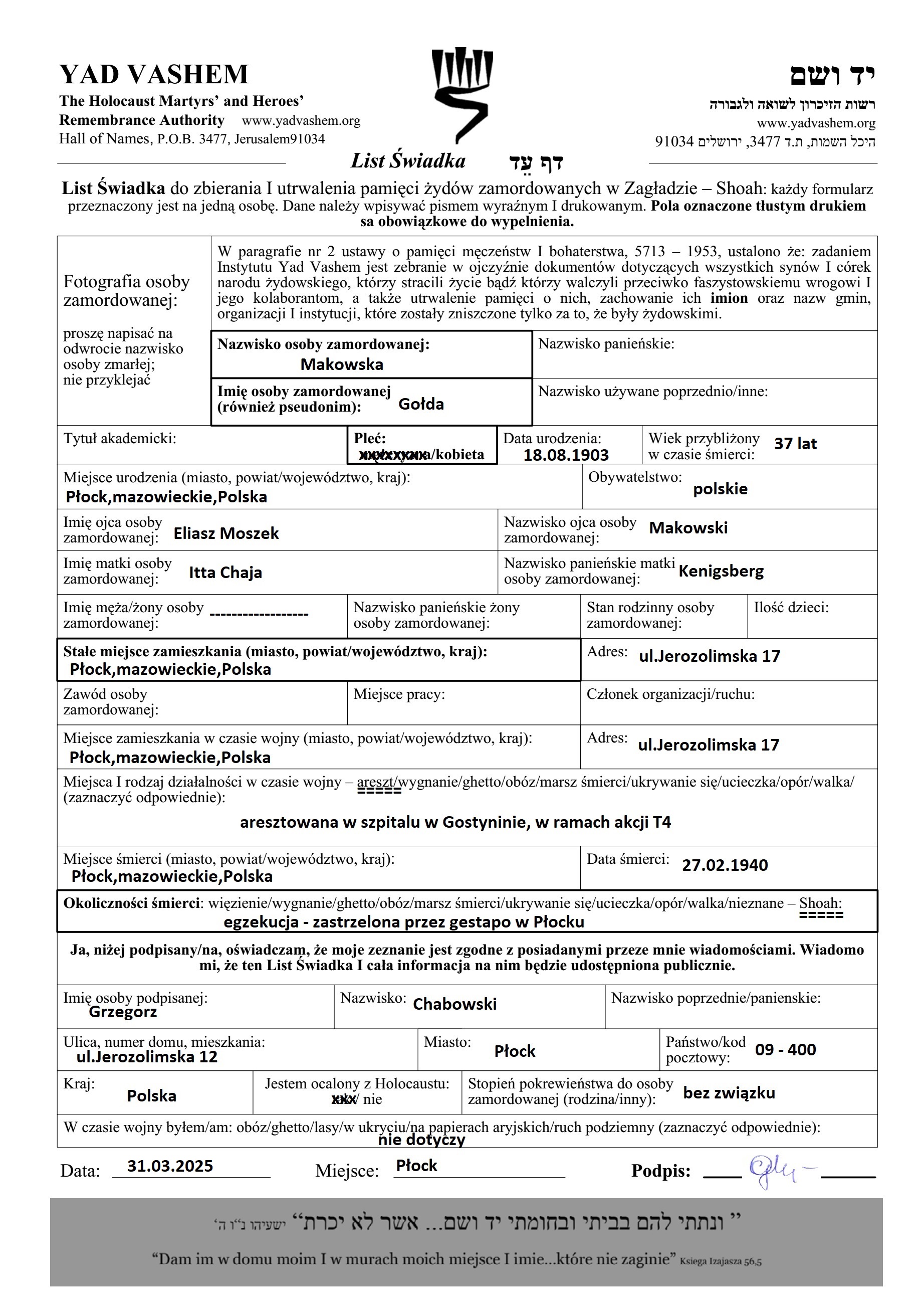 Makowska Gołda 1903 Plock, Poland Page of Testimony