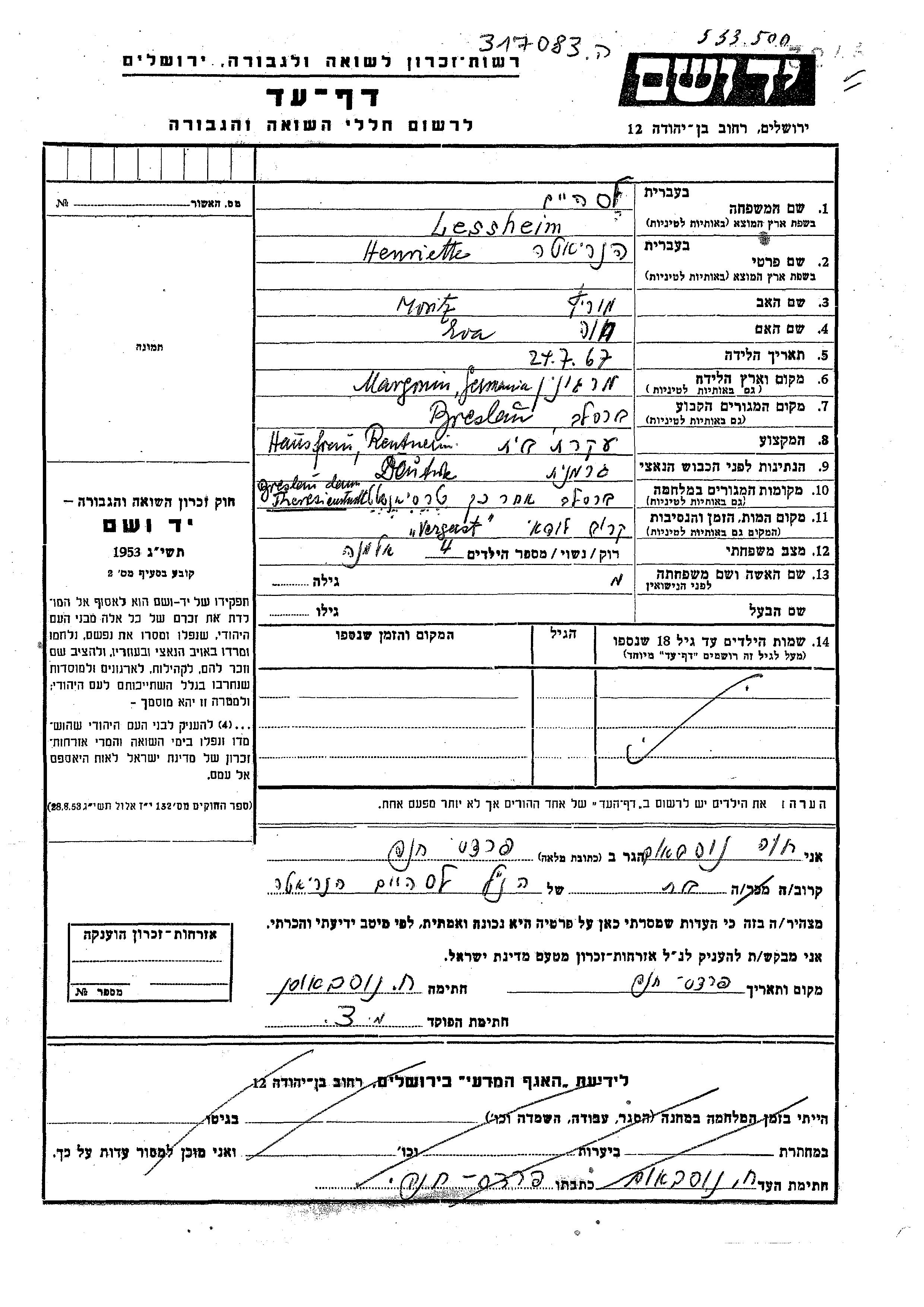 Henriette Lessheim was born in Margonin, Poland, 1867 to Moritz and Eva Khava. She was a housewife and a widow. Prior to WWII she lived in Breslau, Germany. During the war she was in Theresienstadt, Czechoslovakia. Henriette was murdered in the Shoah.