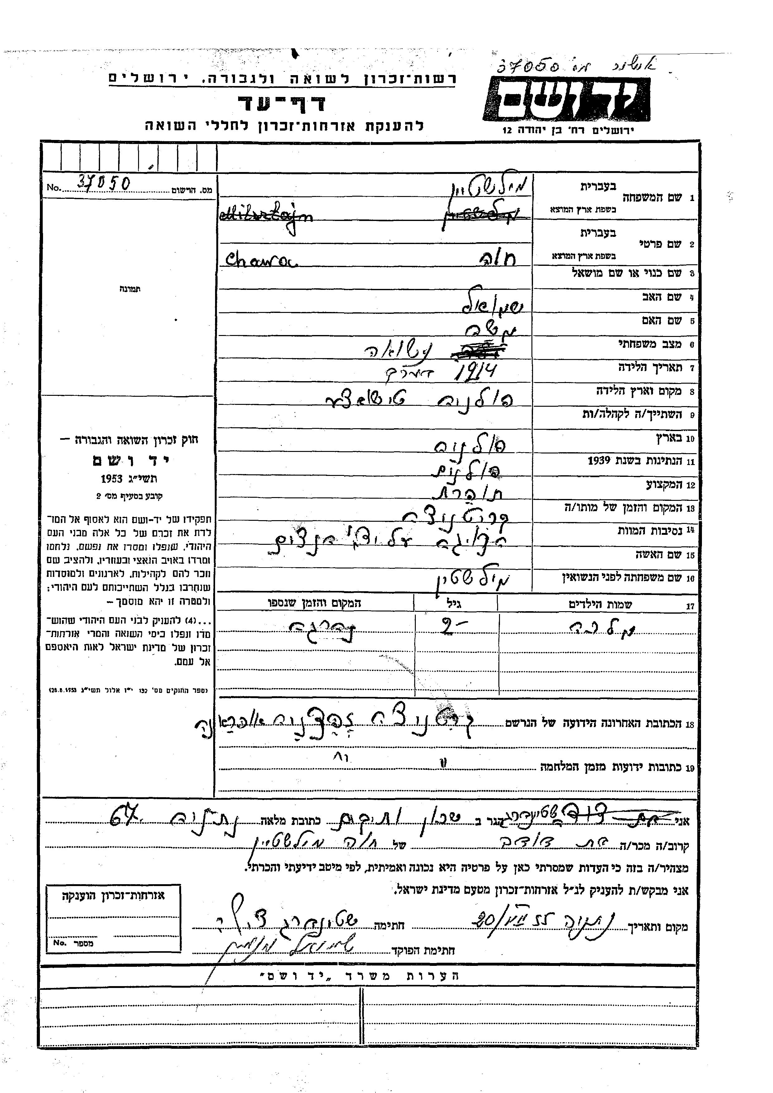 Chawa Milsztajn was born in Tyszowce, Poland, 1914 to Shmuel and Moshe. She was a seamstress and married. Prior to WWII she lived in Krytnica, Poland. During the war she was in Krytnica, Poland. Chawa was murdered in the Shoah. Place of death: Krytnica, Poland.
