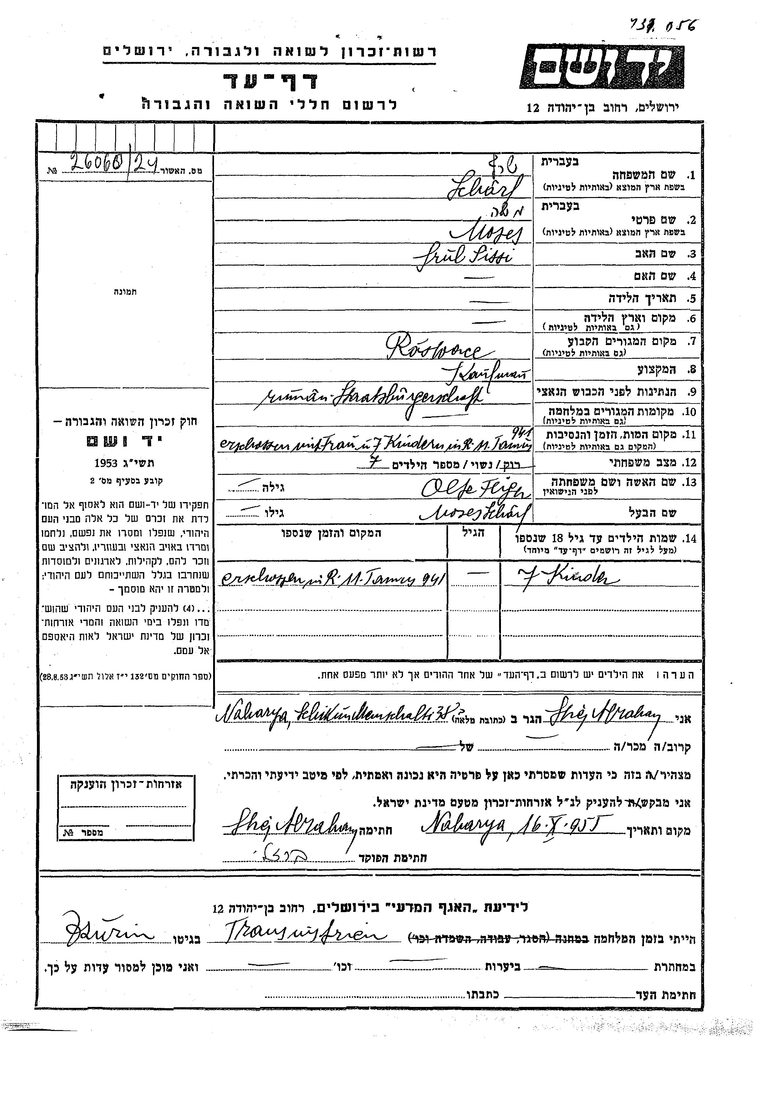 Moses Sharf was born in Rastoace, Romania to Sissi Srul. He was a merchant and married to Alte Feiga. Prior to WWII he lived in Rastoace, Romania. During the war he was in Rastoace, Romania. Moses was murdered in the Shoah. Place of death: unknown, 1941.