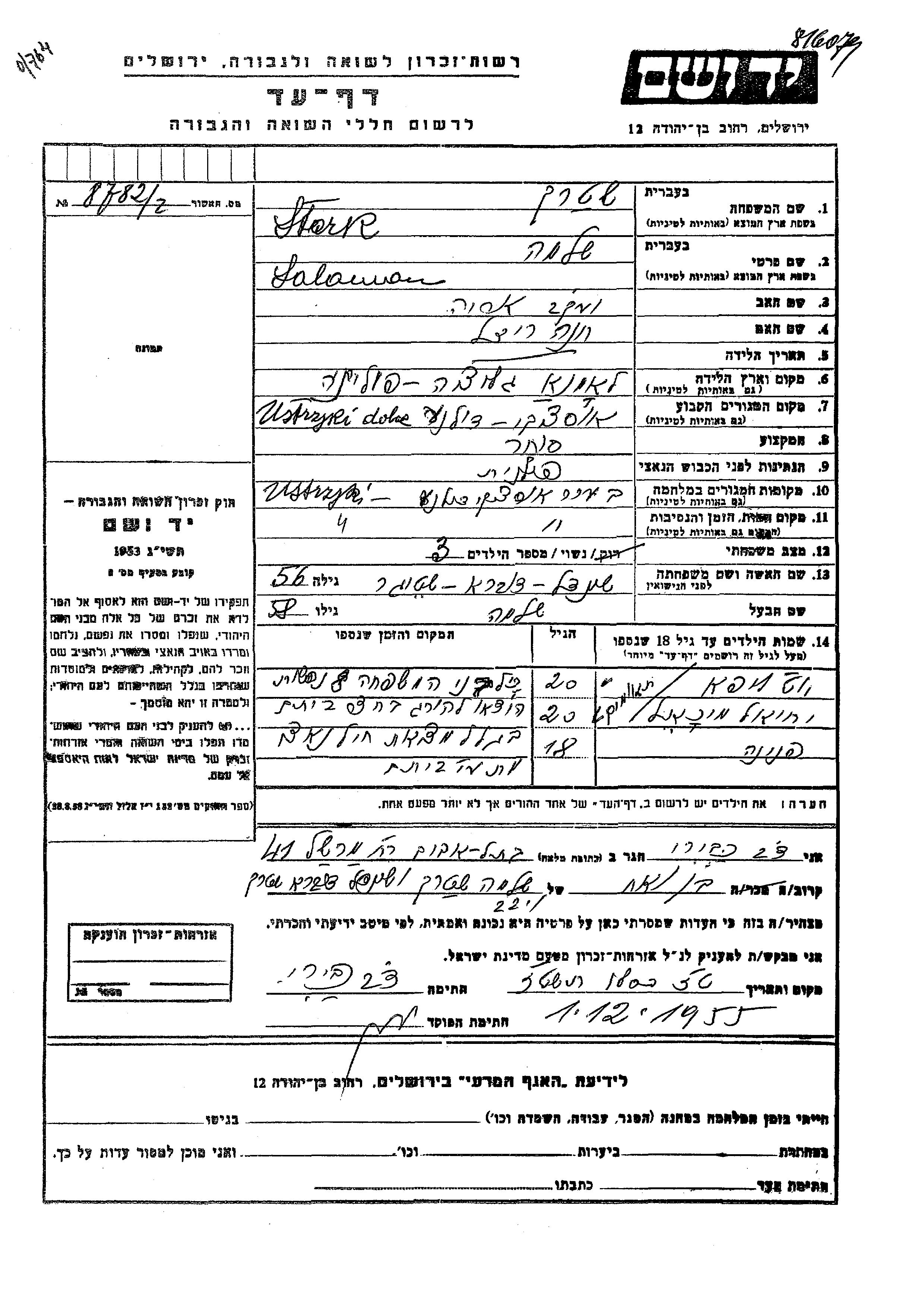Salamon Stark was born in Lomna, Poland to Arie Yaakov and Khana Reizel. He was a merchant and married to Sheindl Dobra nee Shteiger. Prior to WWII he lived in Uschiki Dolne, Poland. During the war he was in Uschiki Dolne, Poland. Salamon was murdered in the Shoah. Place of death: Uschiki Dolne, Poland.