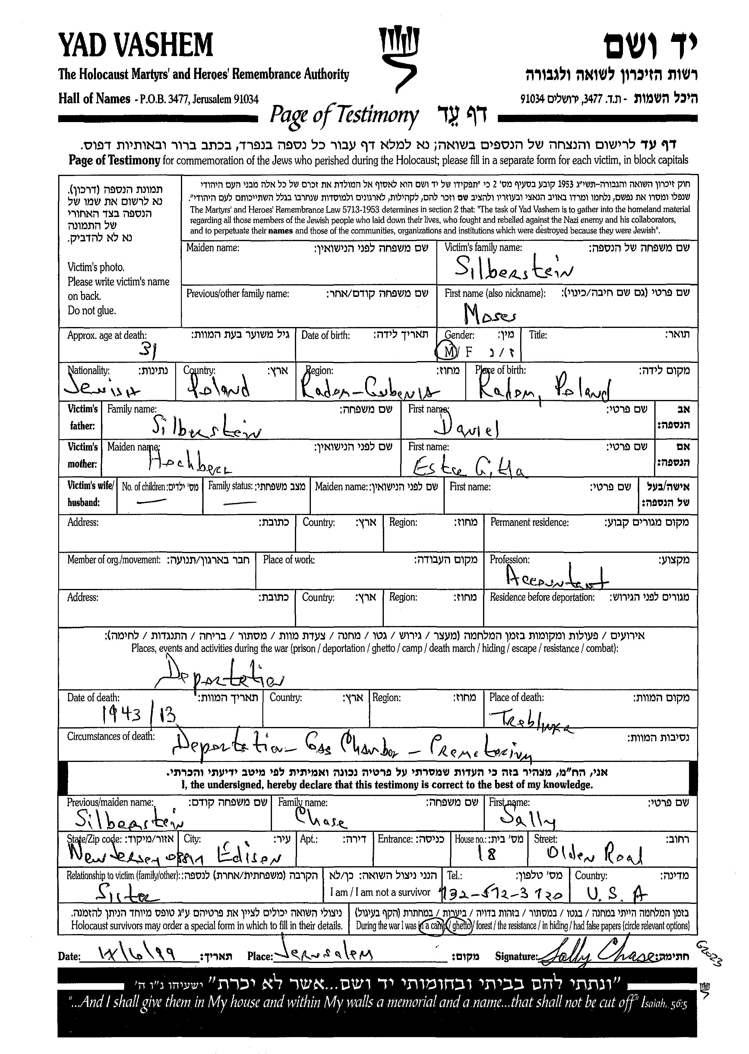 Silberstein Chase Sally Radom, Poland Page of Testimony