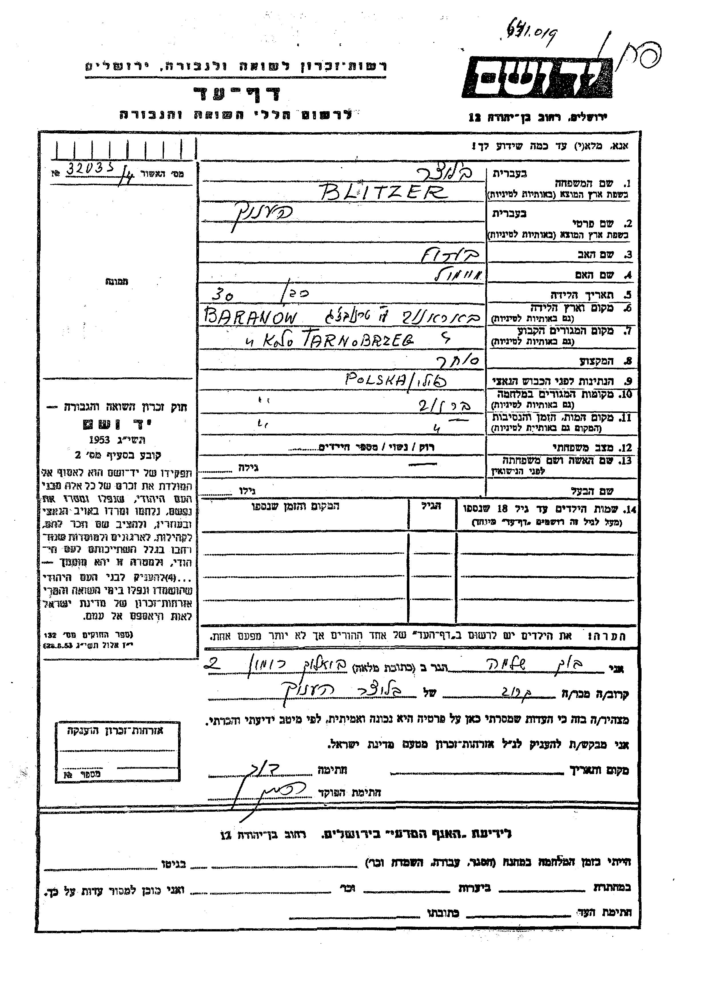 Blitzer Henok Baranów, Poland Page of Testimony