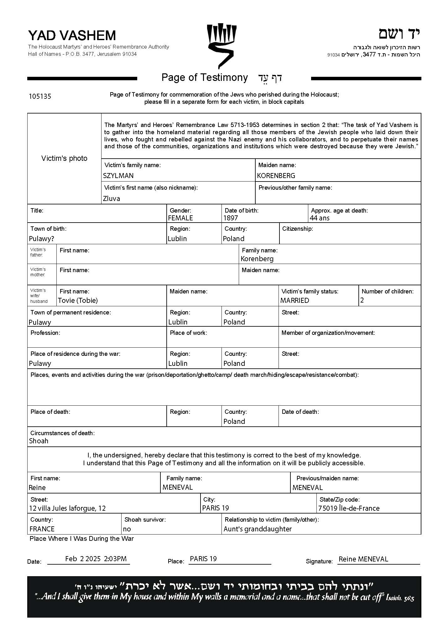 Szylman Zluva 1897 Pulawy, Poland Page of Testimony (digital)