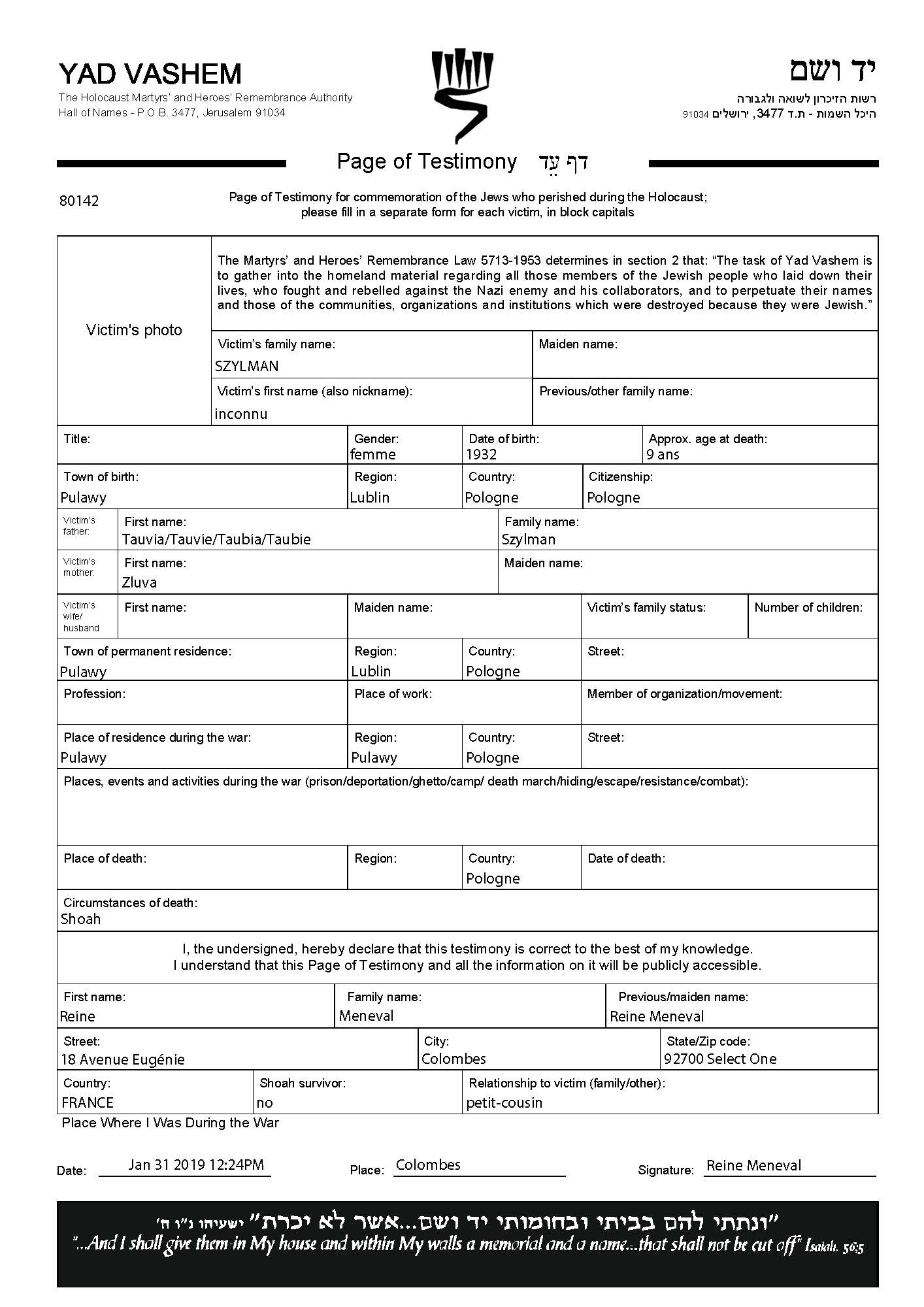 | Szylman | First name unknown | 1932 | Pulawy, Poland | Page of Testimony (digital) |