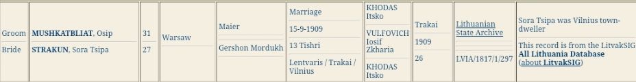 | Mushkatblat Strakun | Sora Tsipa | unstated place, | Marriage certificate | |