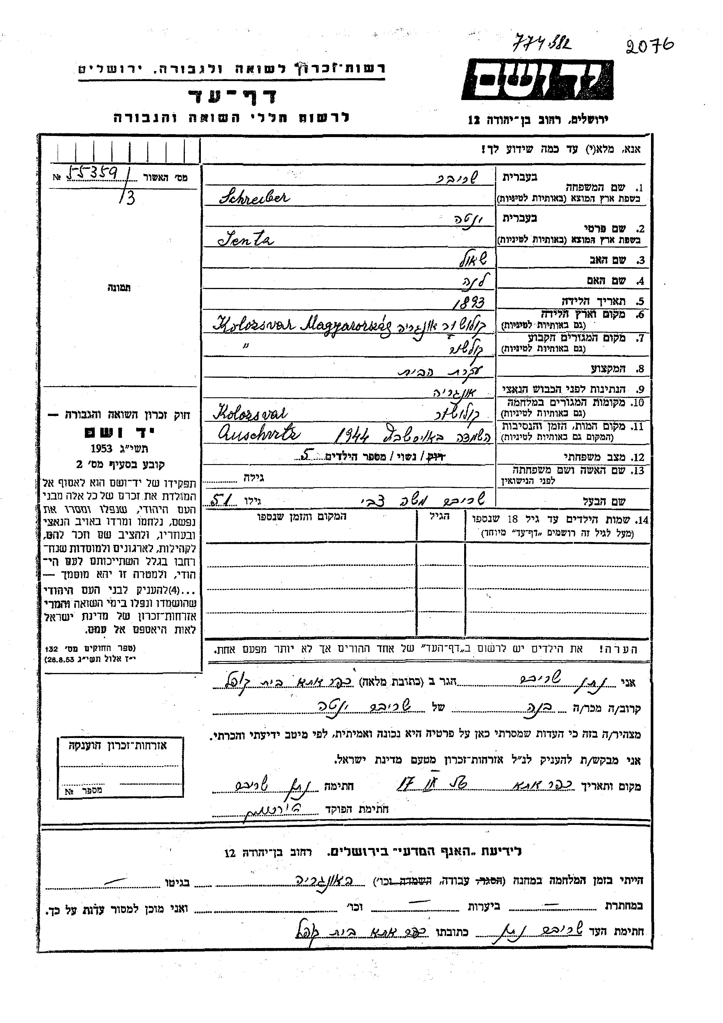 Schreiber Jenta 1893 Koloszvar, Romania Page of Testimony
