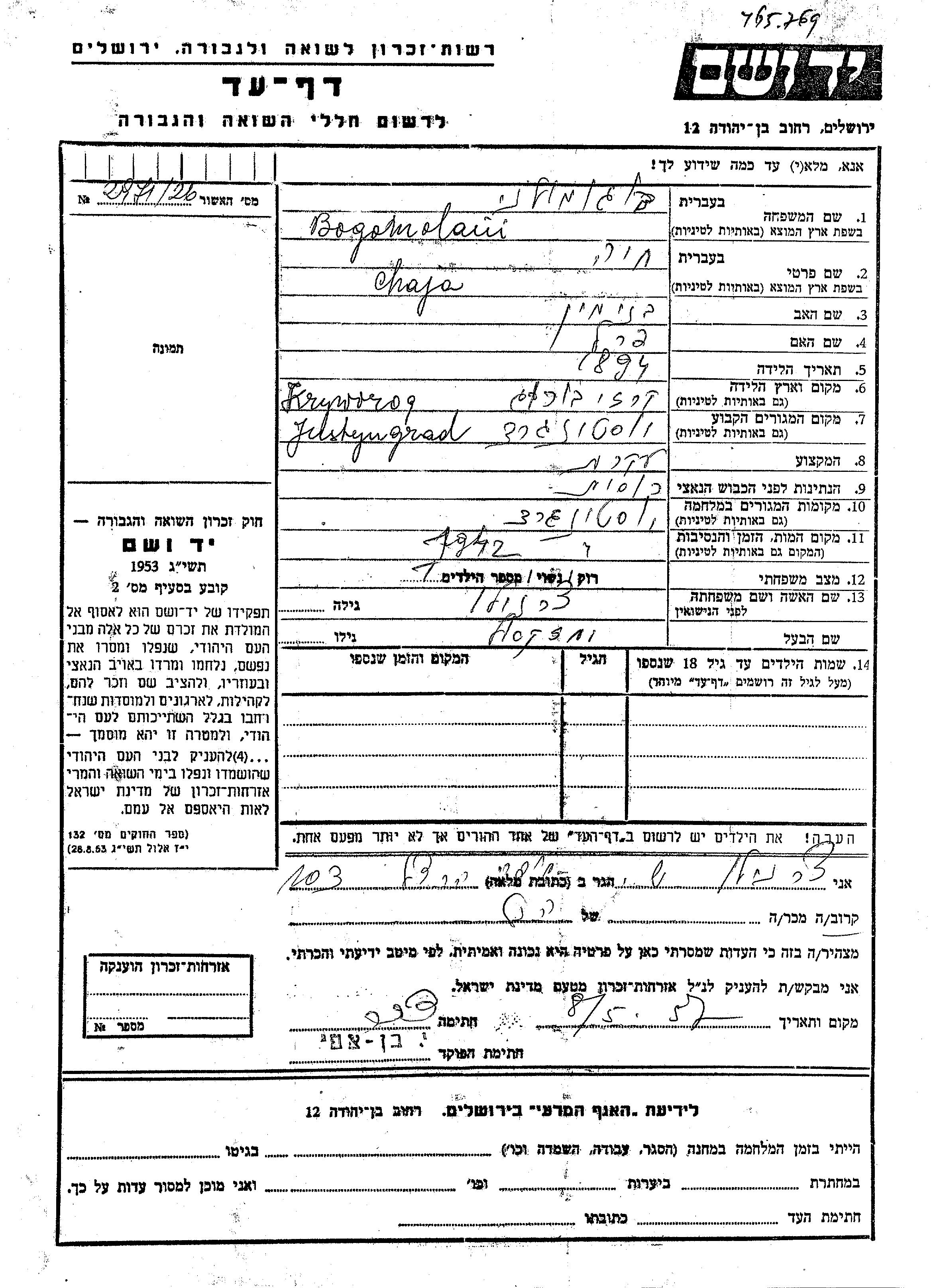 Chaja Bogomolani nee Chernilo was born in Kryworog, Ukraine (USSR), 1894 to Beniamin and Perel. She was a housewife and married to Yekhezkel. Prior to WWII she lived in Yustingrad, Ukraine (USSR). During the war she was in Yustingrad, Ukraine (USSR). Chaja was registered following the evacuation/ in the interior of the Soviet Union.