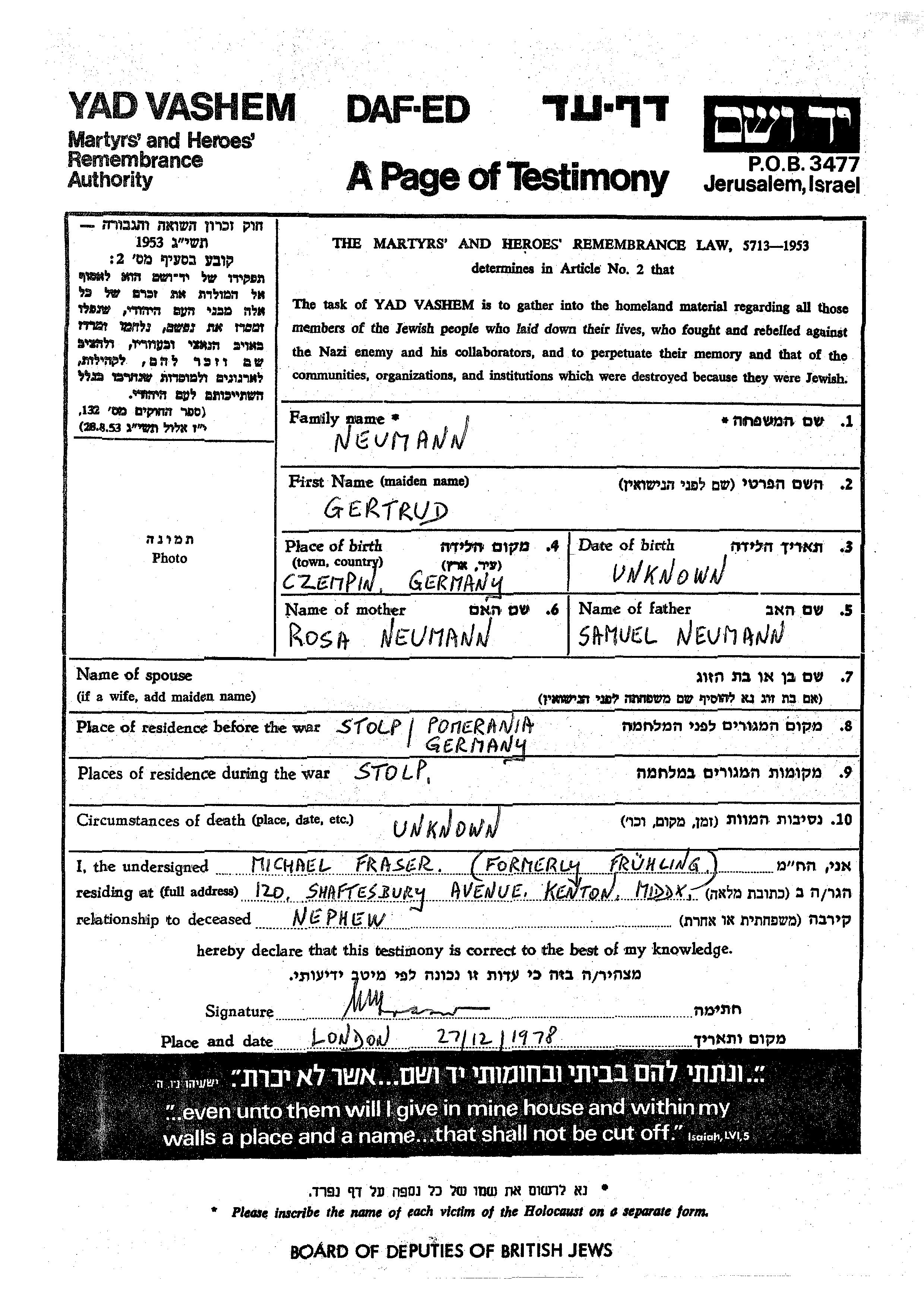 Gertrud Neumann was born in Czempin, Poland to Samuel and Rosa. Prior to WWII she lived in Stolp, Germany. During the war she was in Stolp, Germany. Gertrud was murdered in the Shoah.