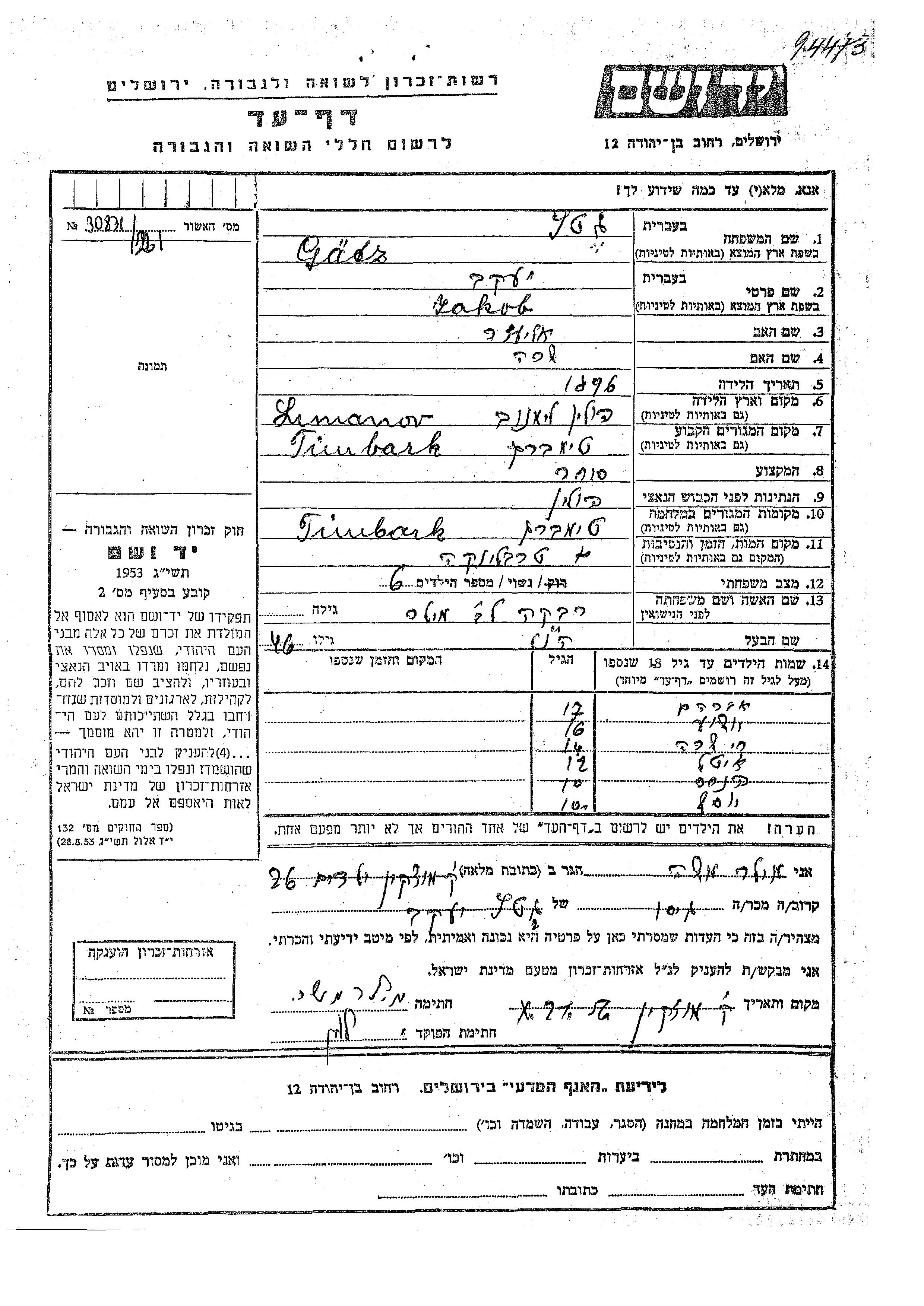 Gatz Getz Jakob 1896 Tymbark, Poland Page of Testimony