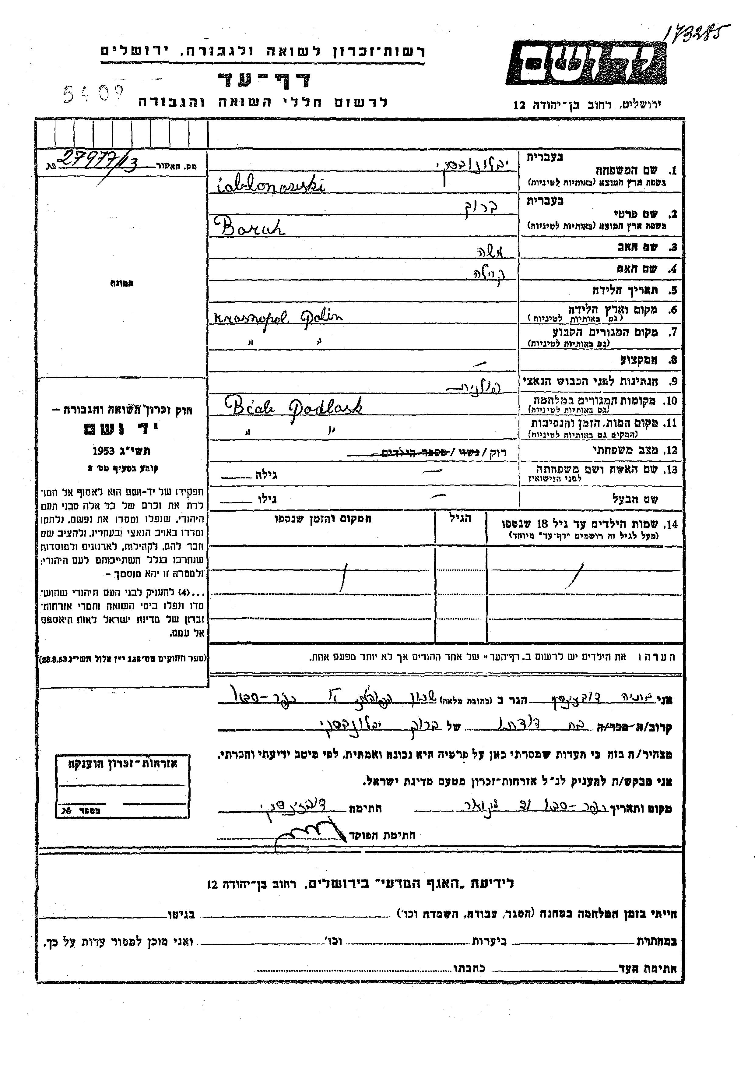 Iablonowski Baruh Krasnopol, Poland Page of Testimony