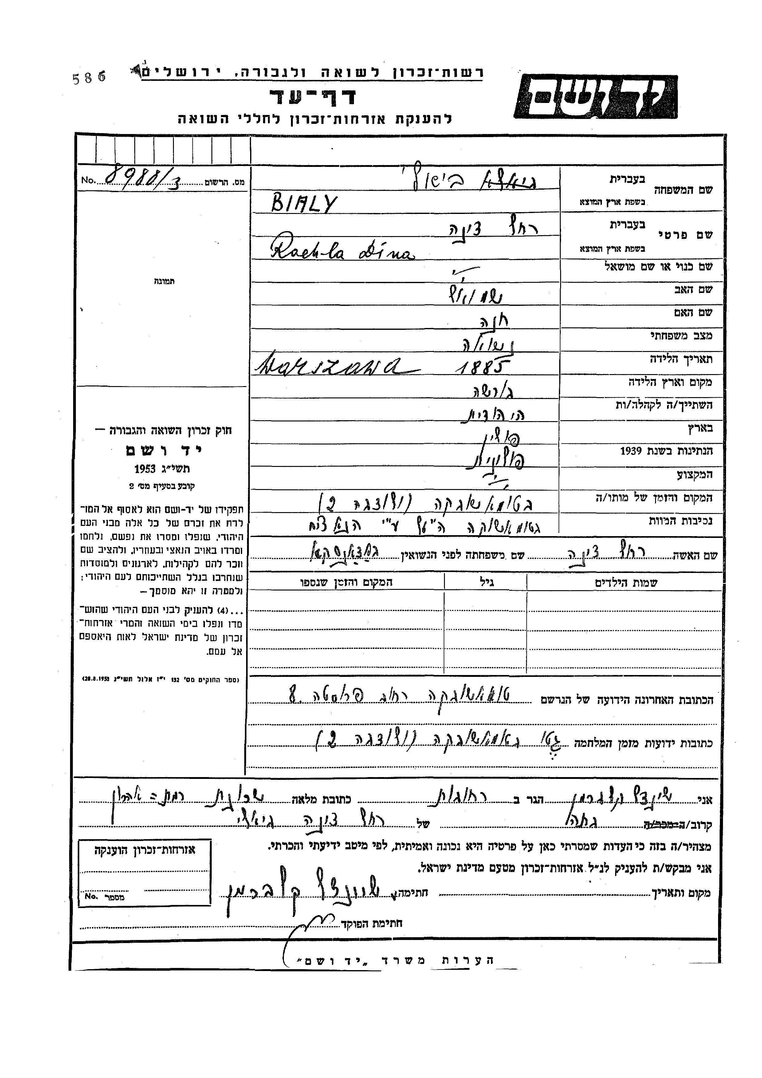 Bialy Rachla Dina 1885 Poland Page of Testimony