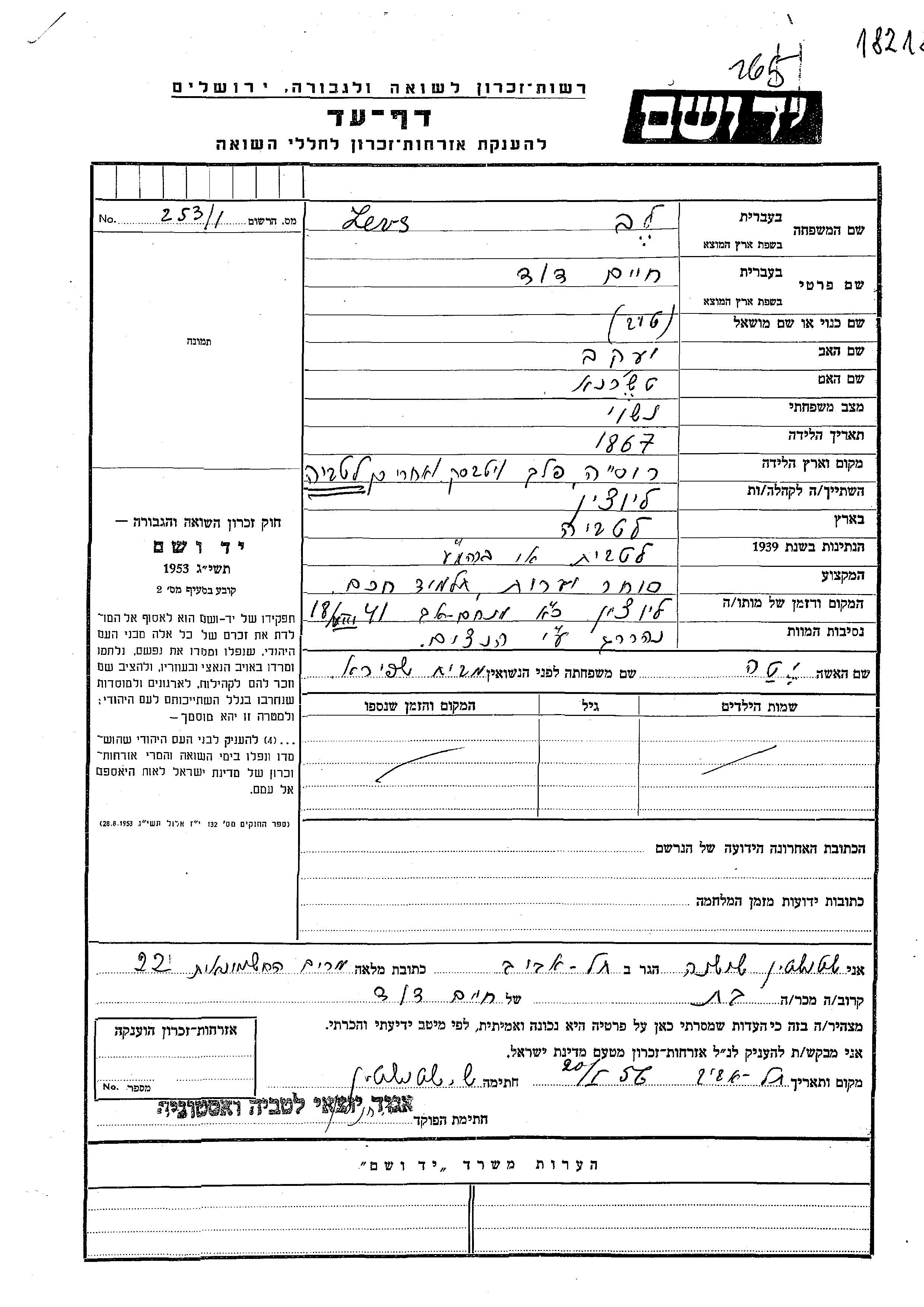 Khaim David Levs was born in Ludza, Latvia, 1867 to Yaakov and Charna. He was a forest merchant. Prior to WWII he lived in Ludza, Latvia. During the war he was in Ludza, Latvia. Khaim David was murdered in the Shoah. Place of death: Ludza, Latvia, 18/08/1941.