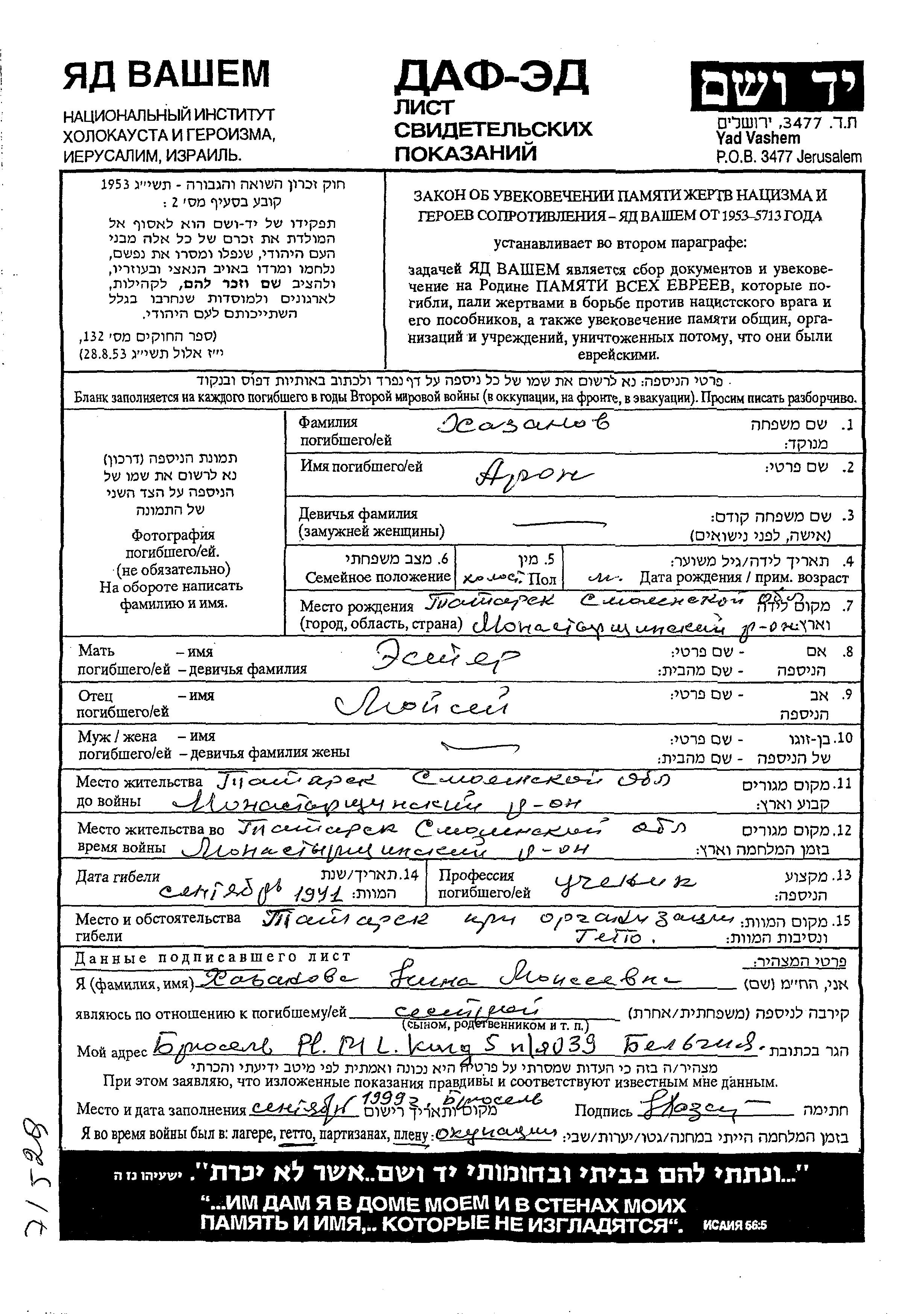 Khazanov Nina Tatarsk, Russia (USSR) Page of Testimony