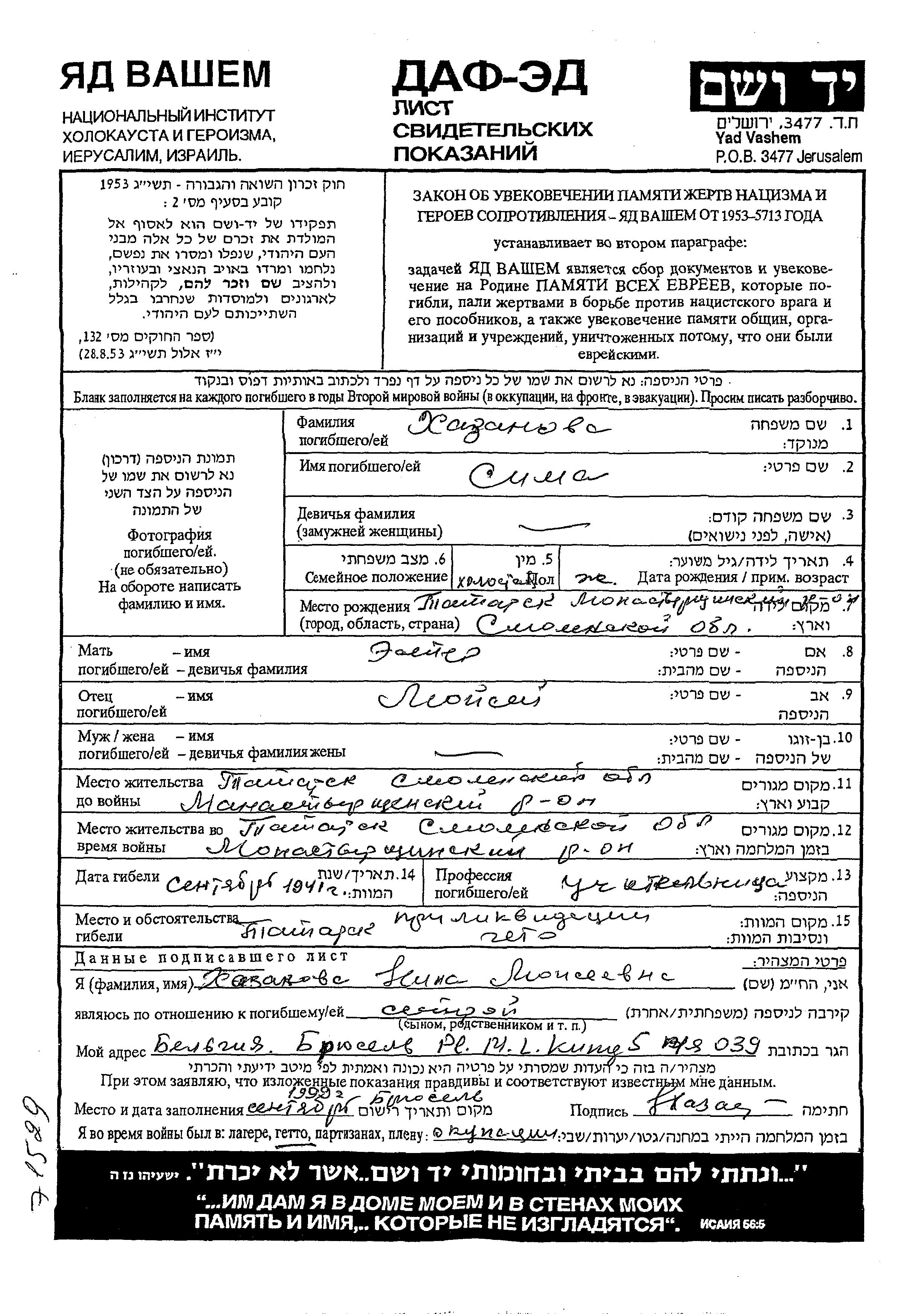 Khazanova Nina Tatarsk, Russia (USSR) Page of Testimony