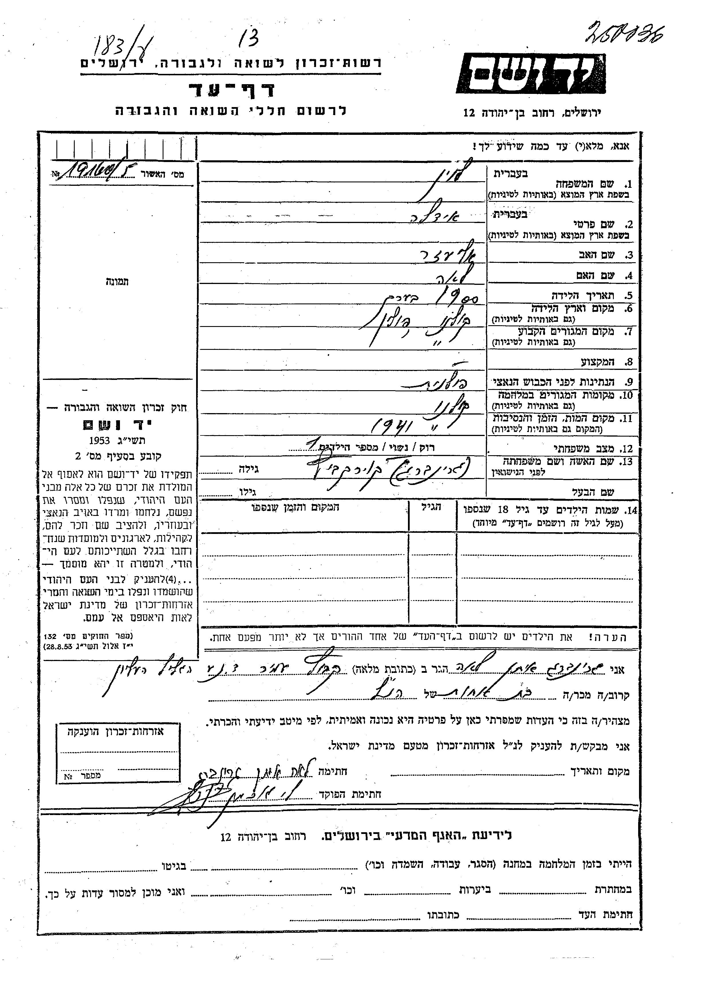Eidle Levin nee Kurkevitz was born in Kolno, Poland, 1900 to Eliezer and Lea. She was married. Prior to WWII she lived in Kolno, Poland. During the war she was in Kolno, Poland. Eidle was murdered in the Shoah. Place of death: Kolno, Poland, 1941.