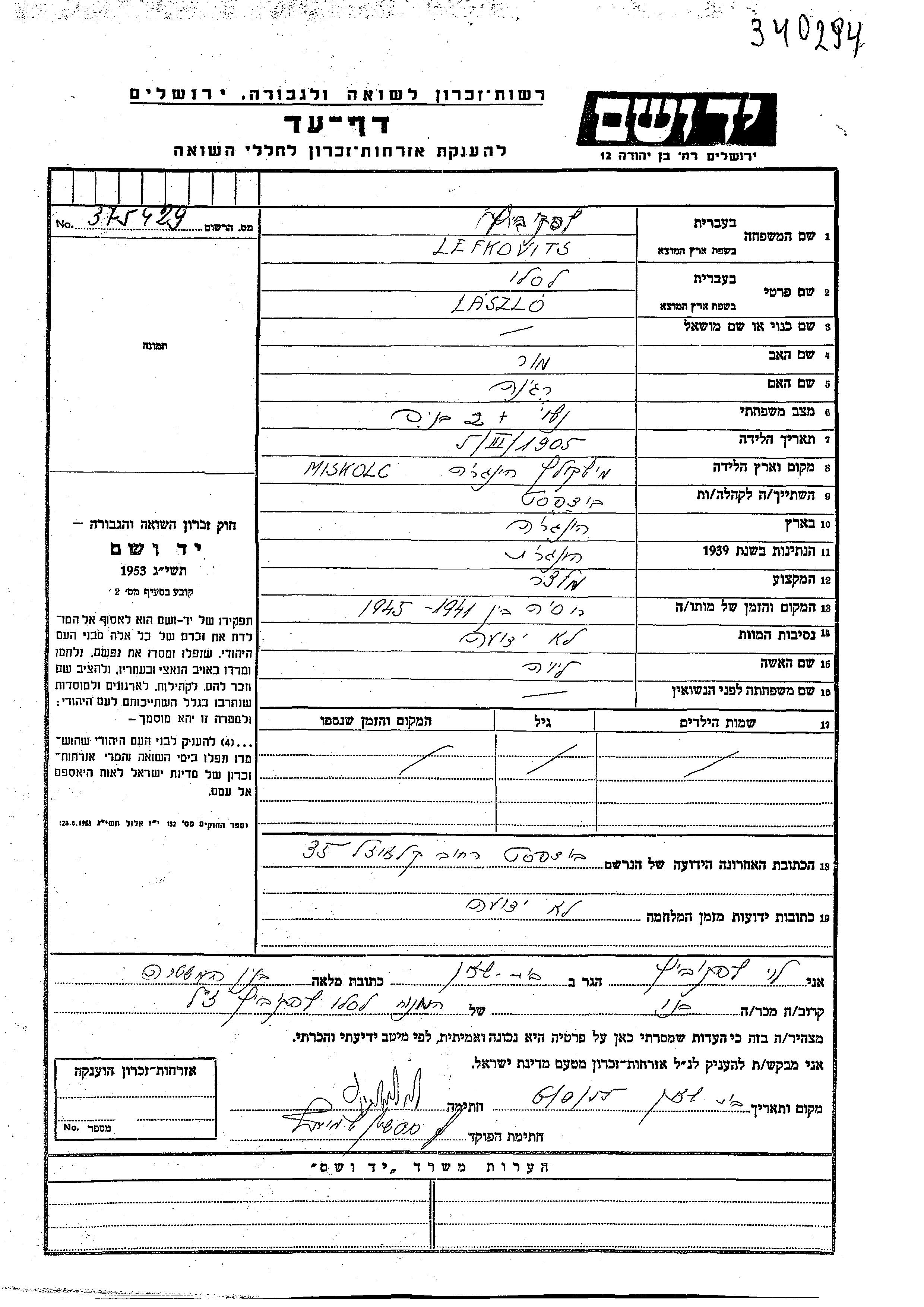 Lefkovits Laszlo 1905 Budapest, Hungary Page of Testimony