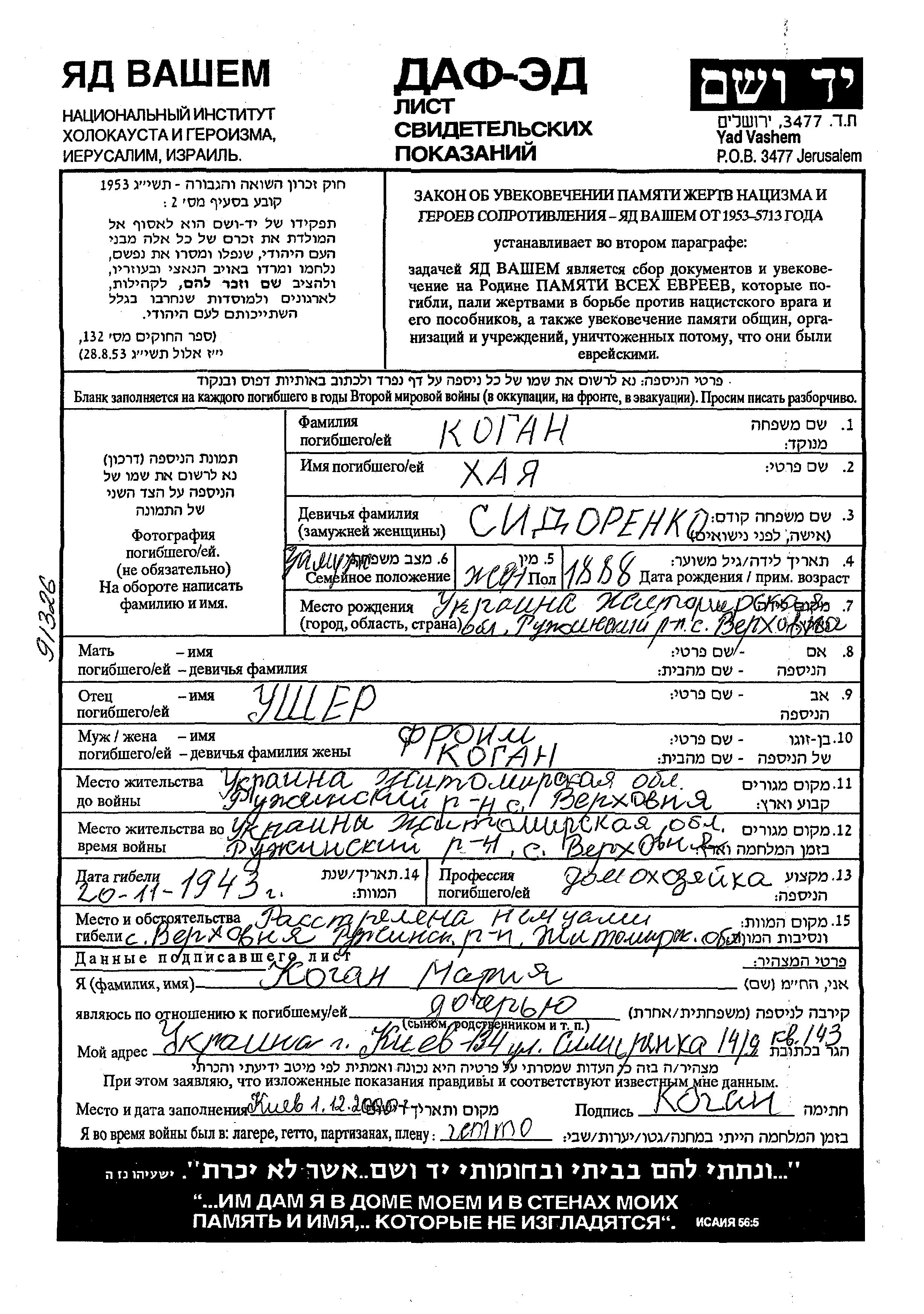 Kogan Maria Verkhovnia, Ukraine (USSR) Page of Testimony