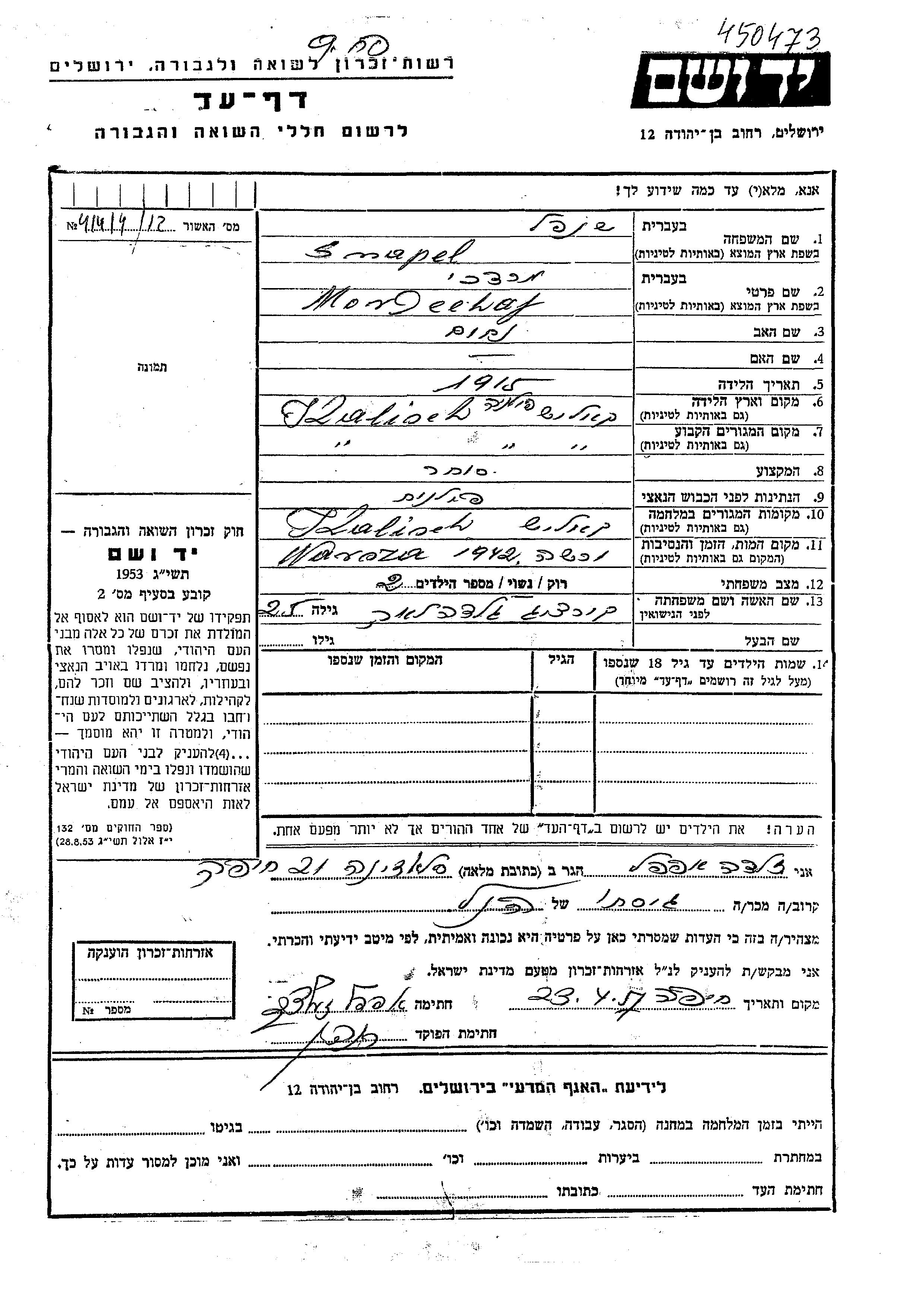 Mordechay Snapel was born in Kalusz, Poland, 1915 to Nakhum. He was a merchant and married to Galda Lea nee Kurtzveg. Prior to WWII he lived in Kalusz, Poland. During the war he was in Kalusz, Poland. Mordechay was murdered in the Shoah. Place of death: Warsaw, Poland, 1942.